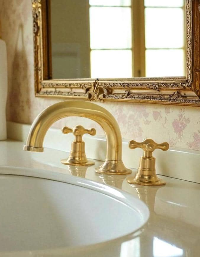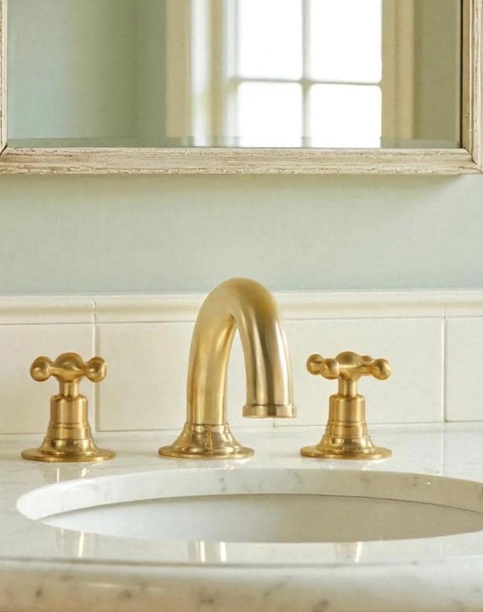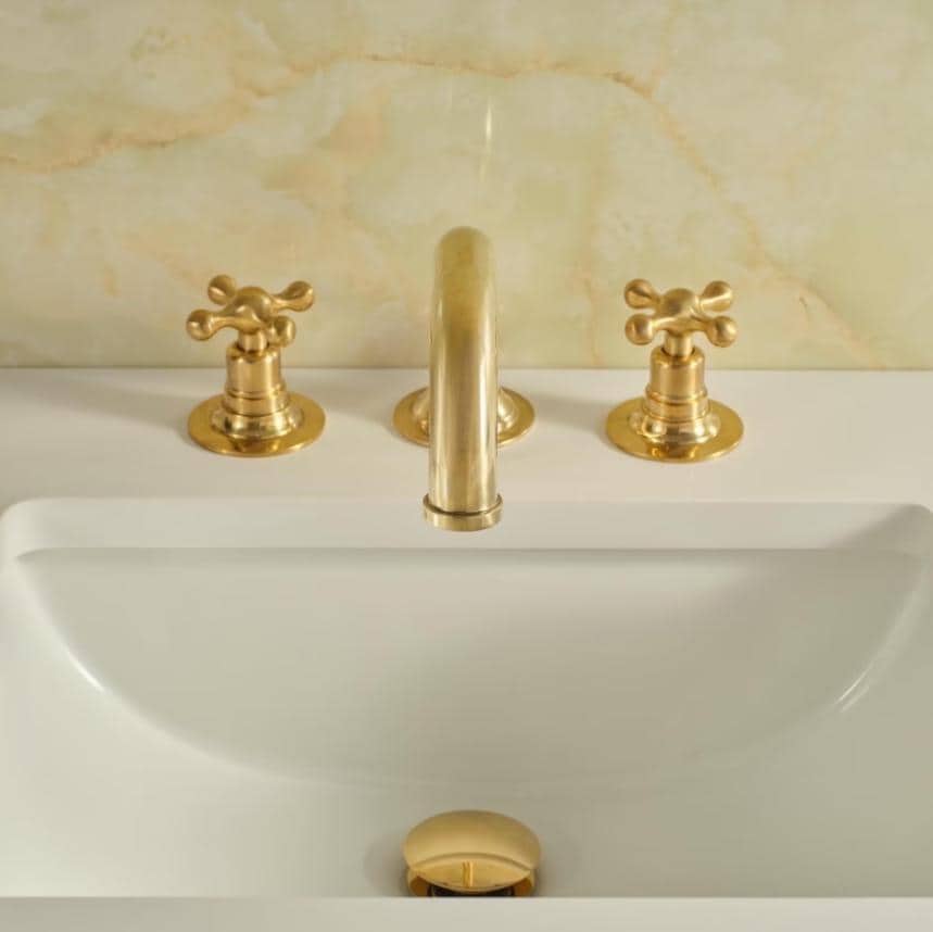 This unlacquered brass widespread bathroom faucet brings timeless elegance to your sink area. Designed for 3-hole deck mount installation (8”–16”), it fits perfectly in spacious bathrooms.
