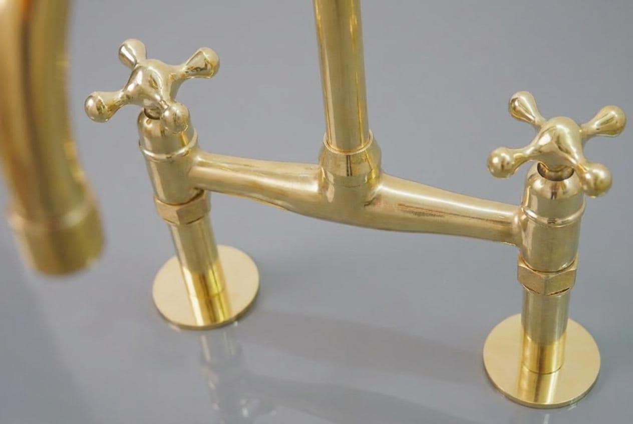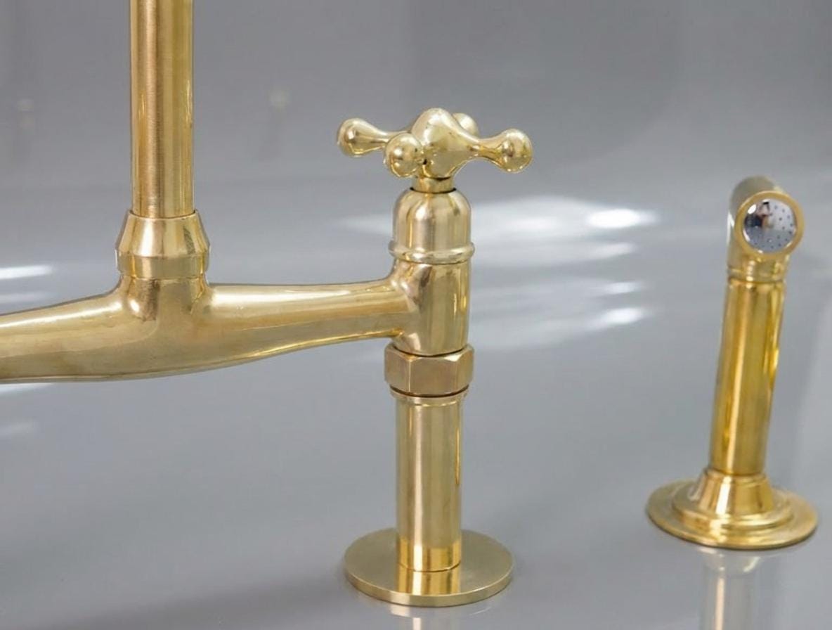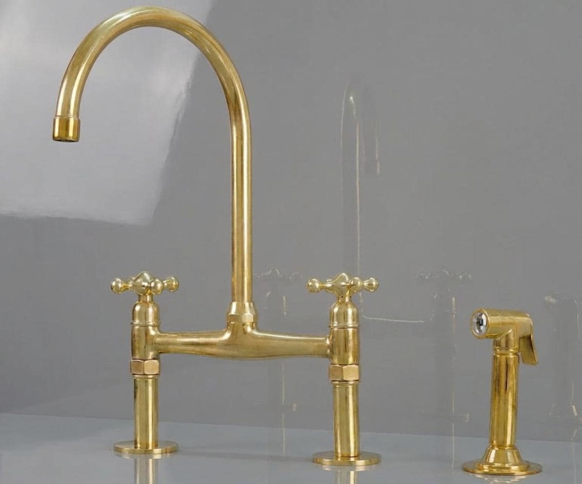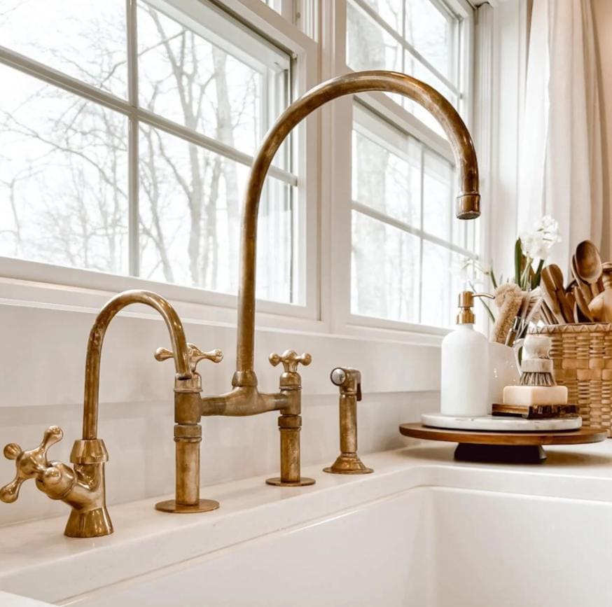 Transform your kitchen with our stunning Unlacquered Brass Kitchen Faucet. This unique piece features a timeless appeal, allowing it to develop a beautiful, worn patina over time. Embrace the charm of antique and vintage aesthetics blended with a touch of elegance. The high-quality craftsmanship and captivating gold tones make this faucet a standout choice for your new home. Discover the perfect blend of vintage allure and modern functionality with our unlacquered brass kitchen faucet.
