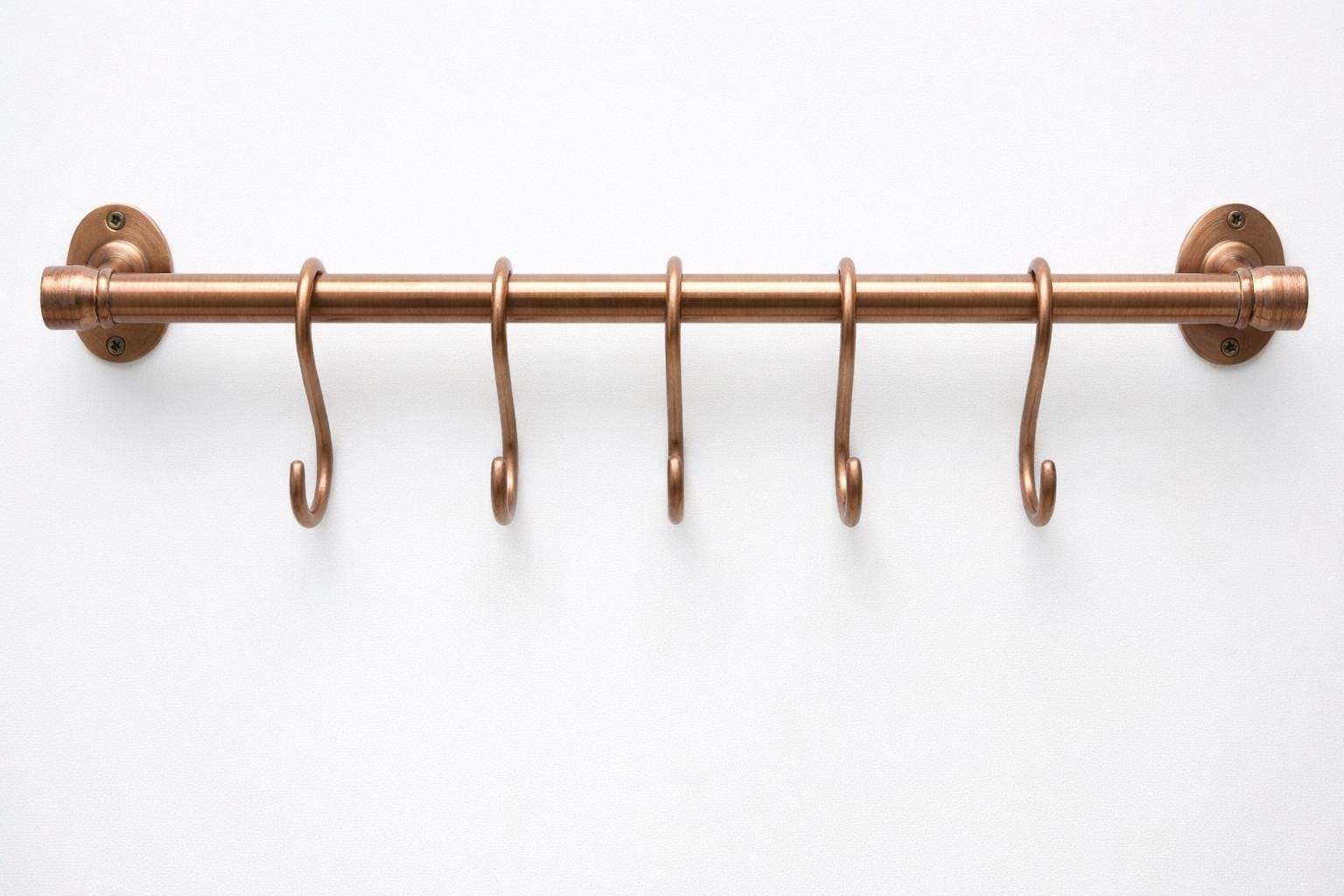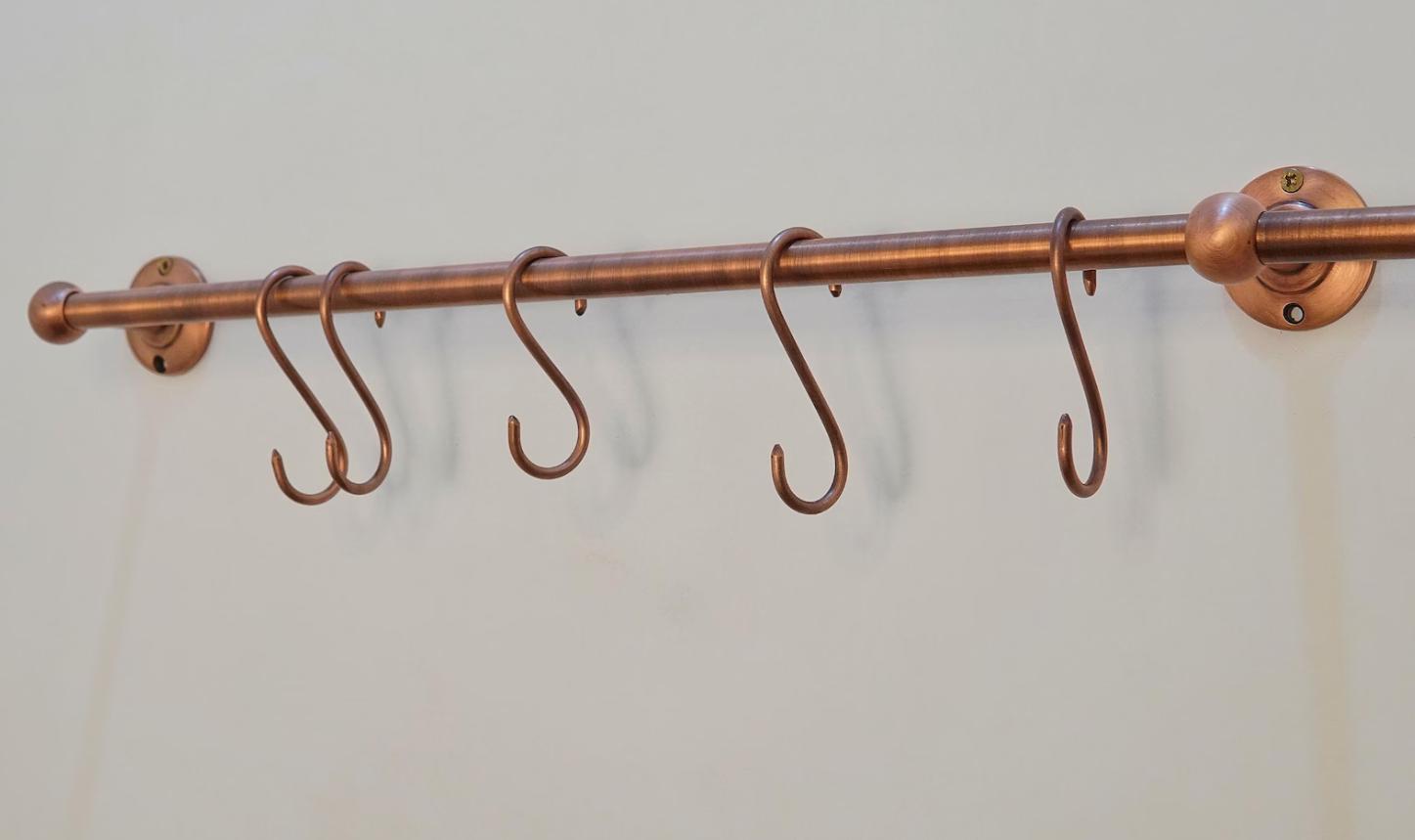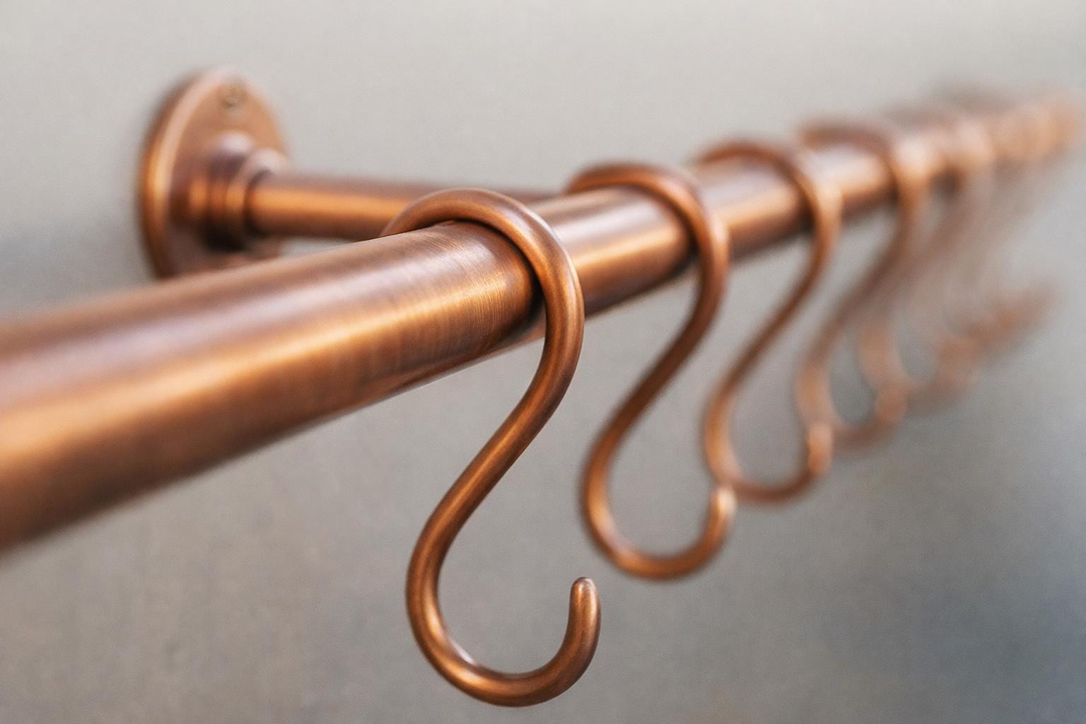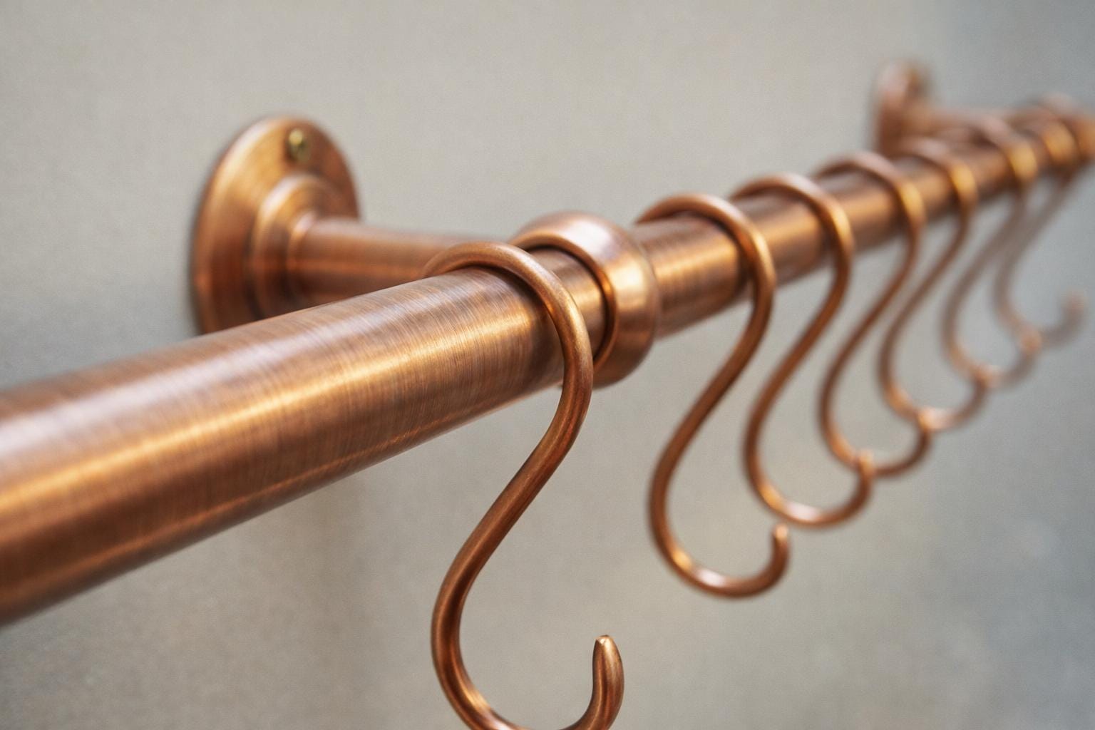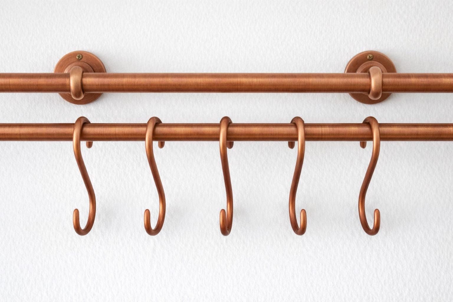 Elevate your kitchen storage with our Antique Copper Pot Rail, beautifully paired with handmade solid brass S hooks. Thoughtfully crafted for both function and style, this pot rail is the perfect complement to industrial pipe racks and rustic or modern kitchen interiors. Whether you're hanging heavy cast iron skillets or everyday utensils, this rail offers reliable strength and timeless elegance.