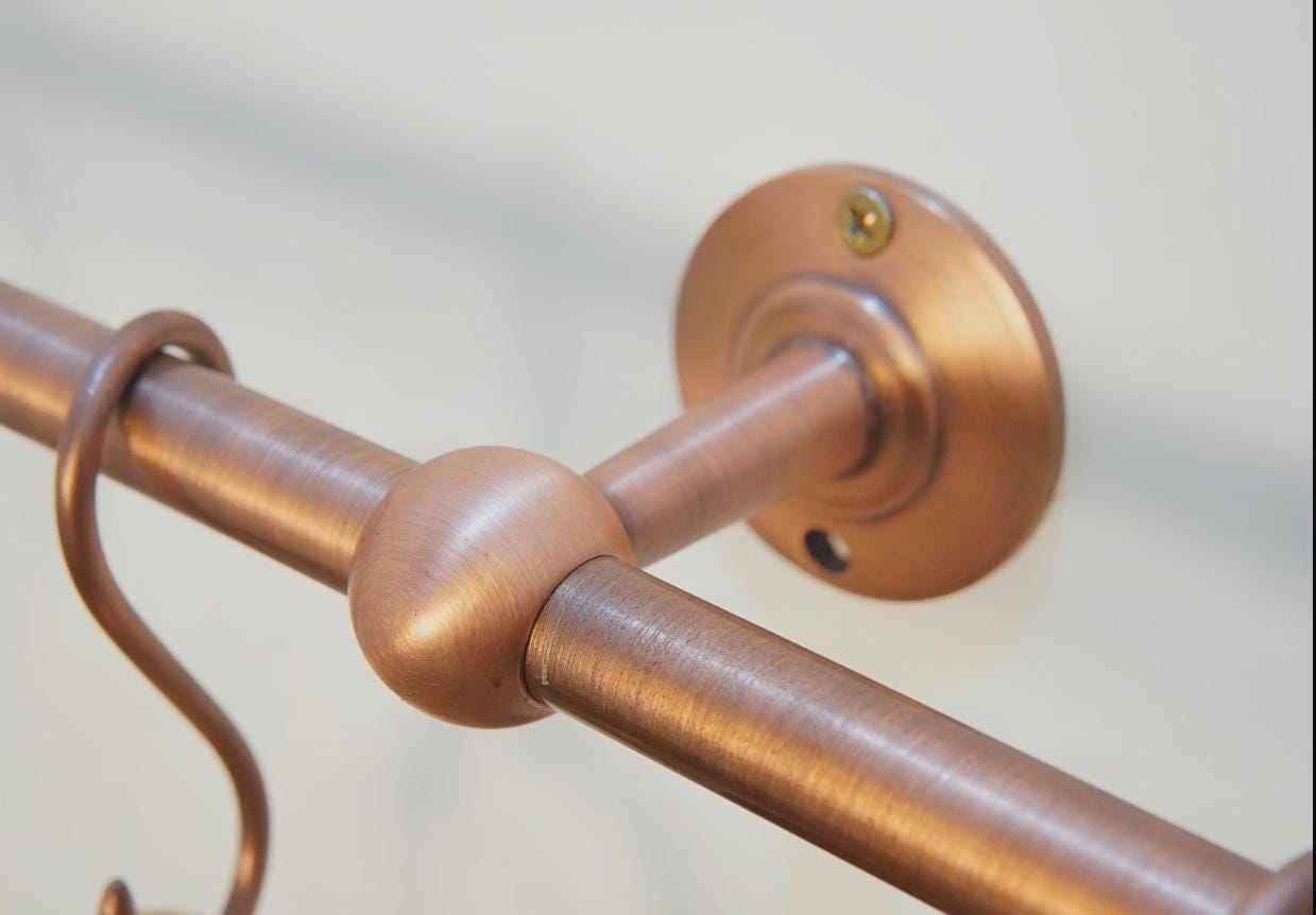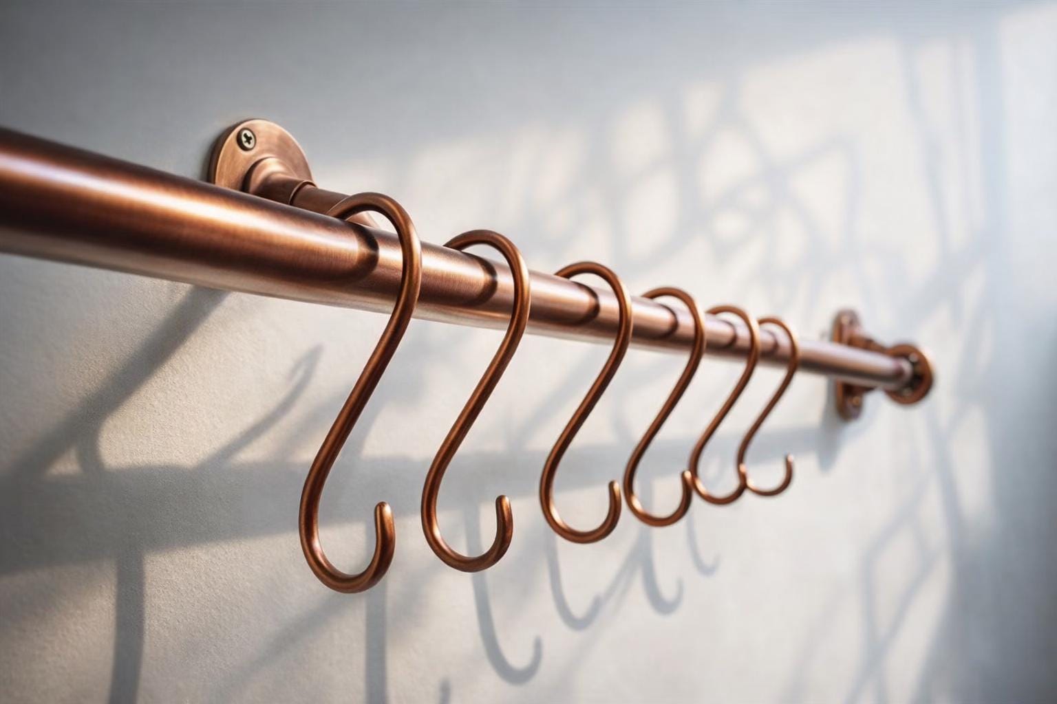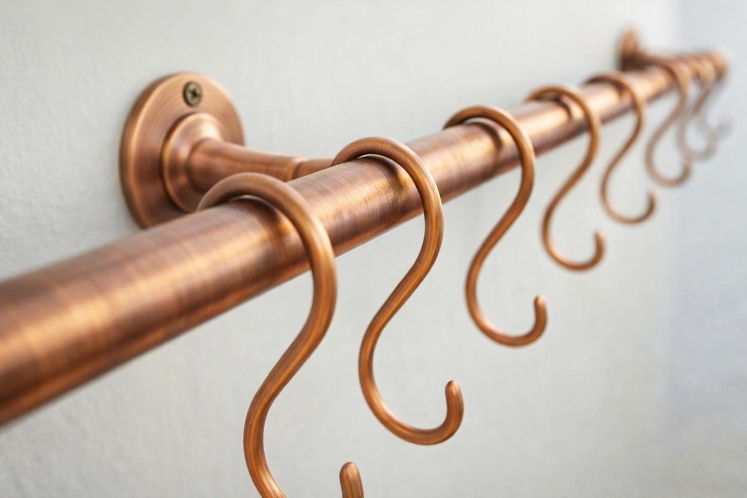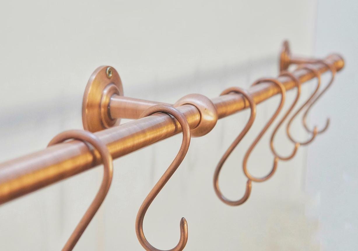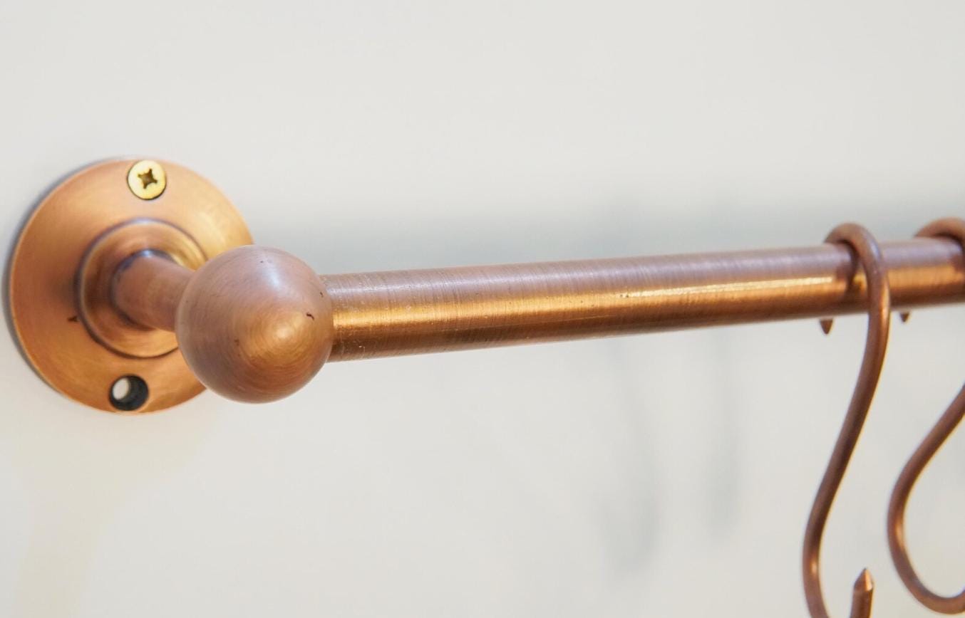 Elevate your kitchen storage with our Antique Copper Pot Rail, beautifully paired with handmade solid brass S hooks. Thoughtfully crafted for both function and style, this pot rail is the perfect complement to industrial pipe racks and rustic or modern kitchen interiors. Whether you're hanging heavy cast iron skillets or everyday utensils, this rail offers reliable strength and timeless elegance.