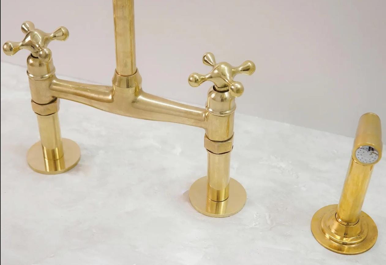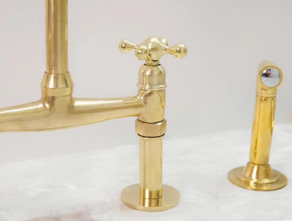Elevate your kitchen with this artisan-crafted brass bridge faucet, complete with a vintage inspired side sprayer. Designed to age beautifully, this faucet begins with a brilliant polished shine and naturally develops a rich, antique patina over time adding character and charm to your space.