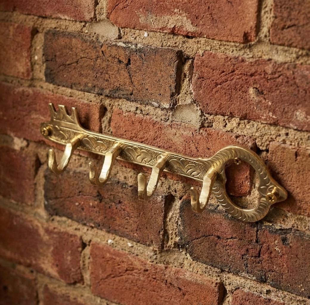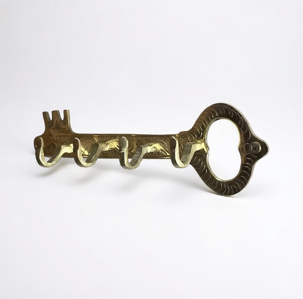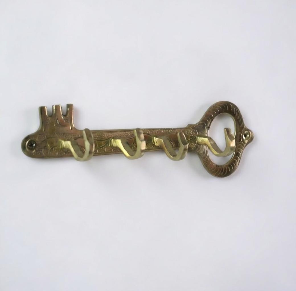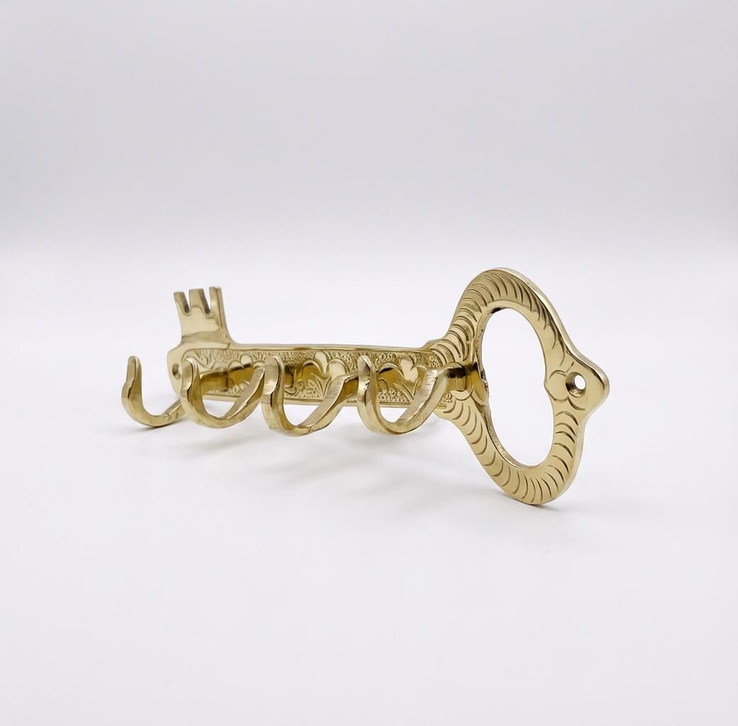 Add a touch of elegant vintage charm to your home with this beautifully crafted solid brass key-shaped wall hook rack. Designed with intricate engraved details and five sturdy hooks, this decorative piece serves as both functional storage and stylish wall décor.