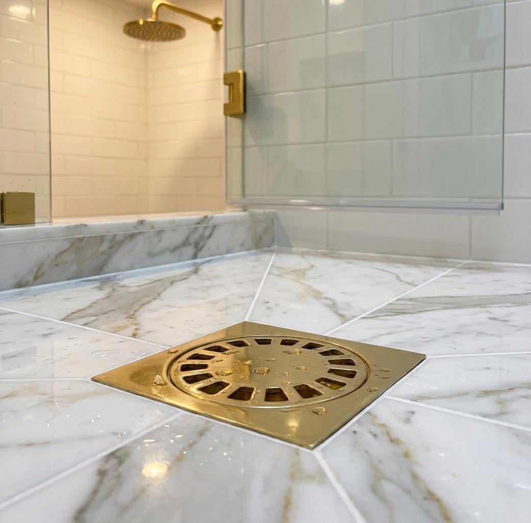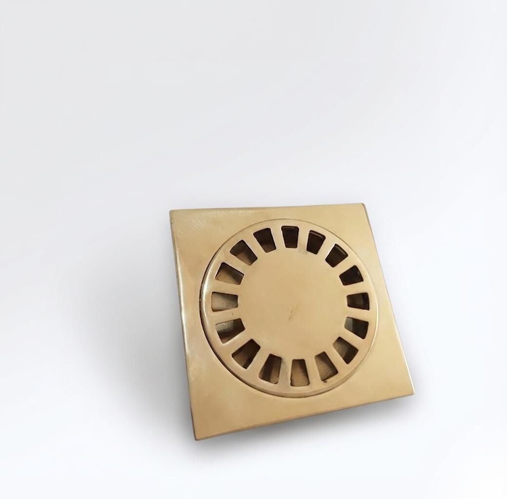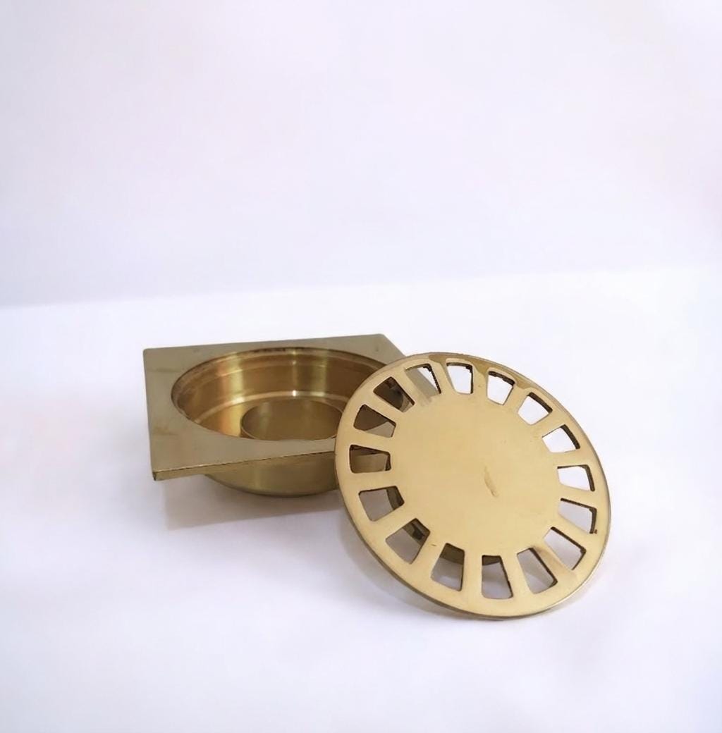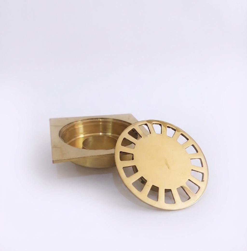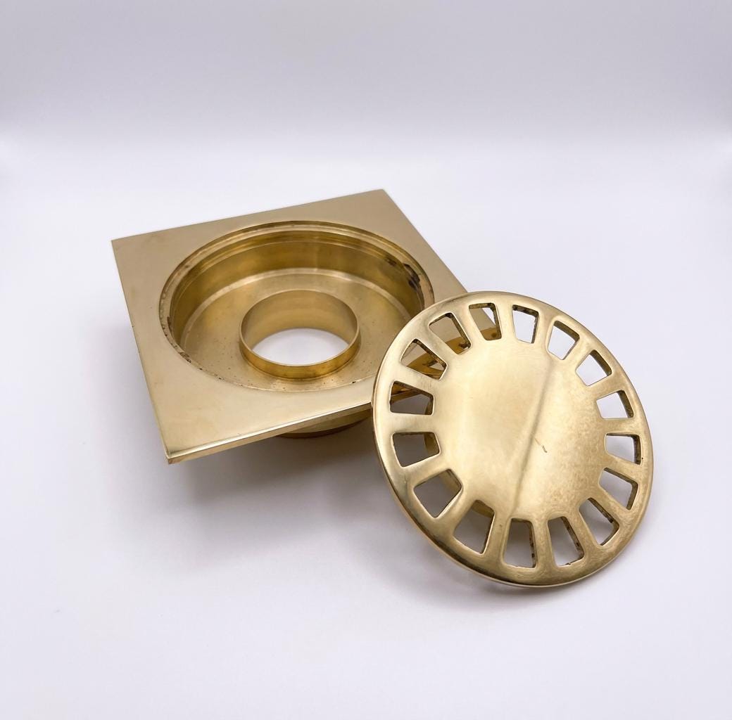 Enhance your bathroom or shower with this solid brass floor drain, designed with a sleek square base and a removable round grate for easy cleaning. Crafted from durable, rust-resistant brass, this drain cover offers long-lasting performance while adding a warm, elegant touch to your space.
