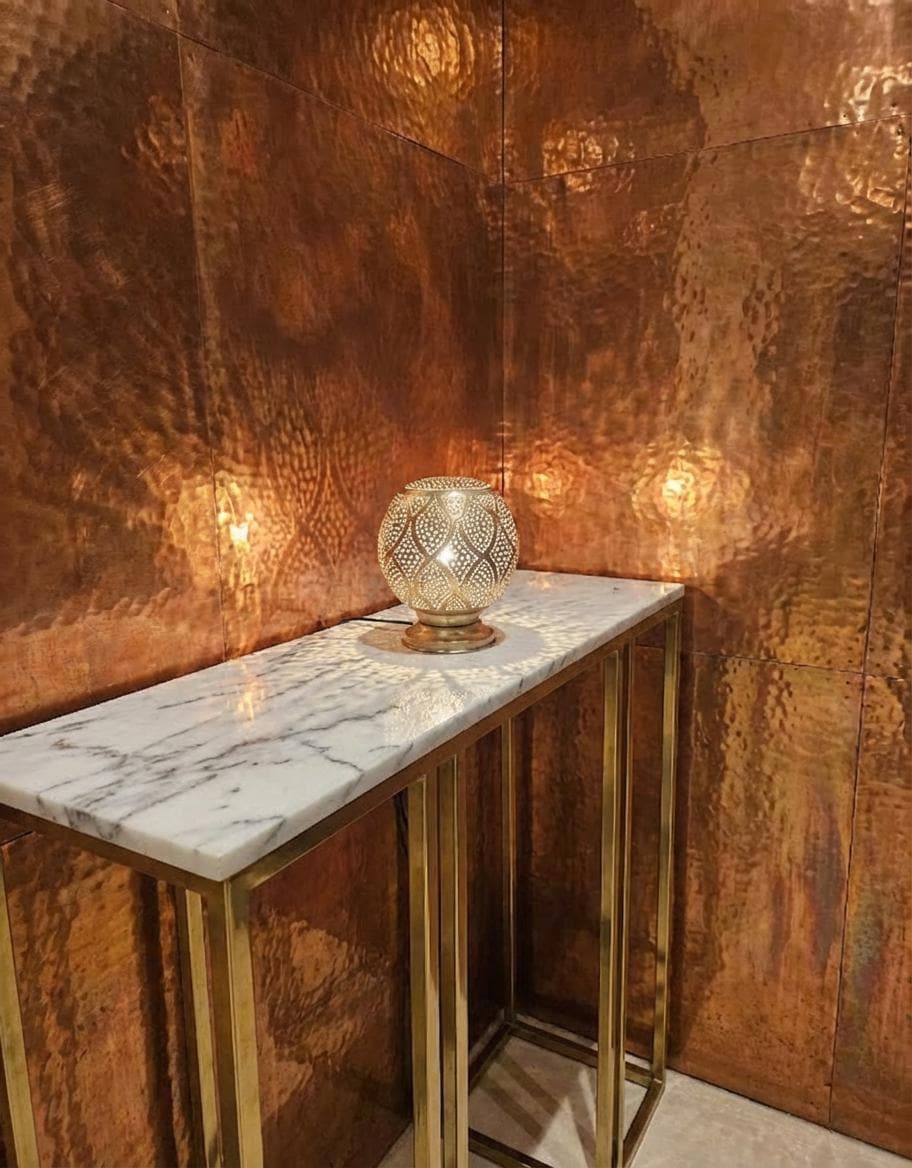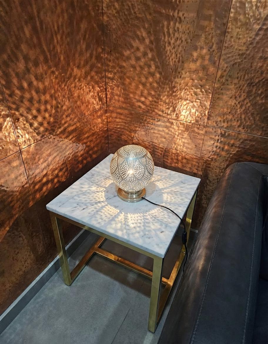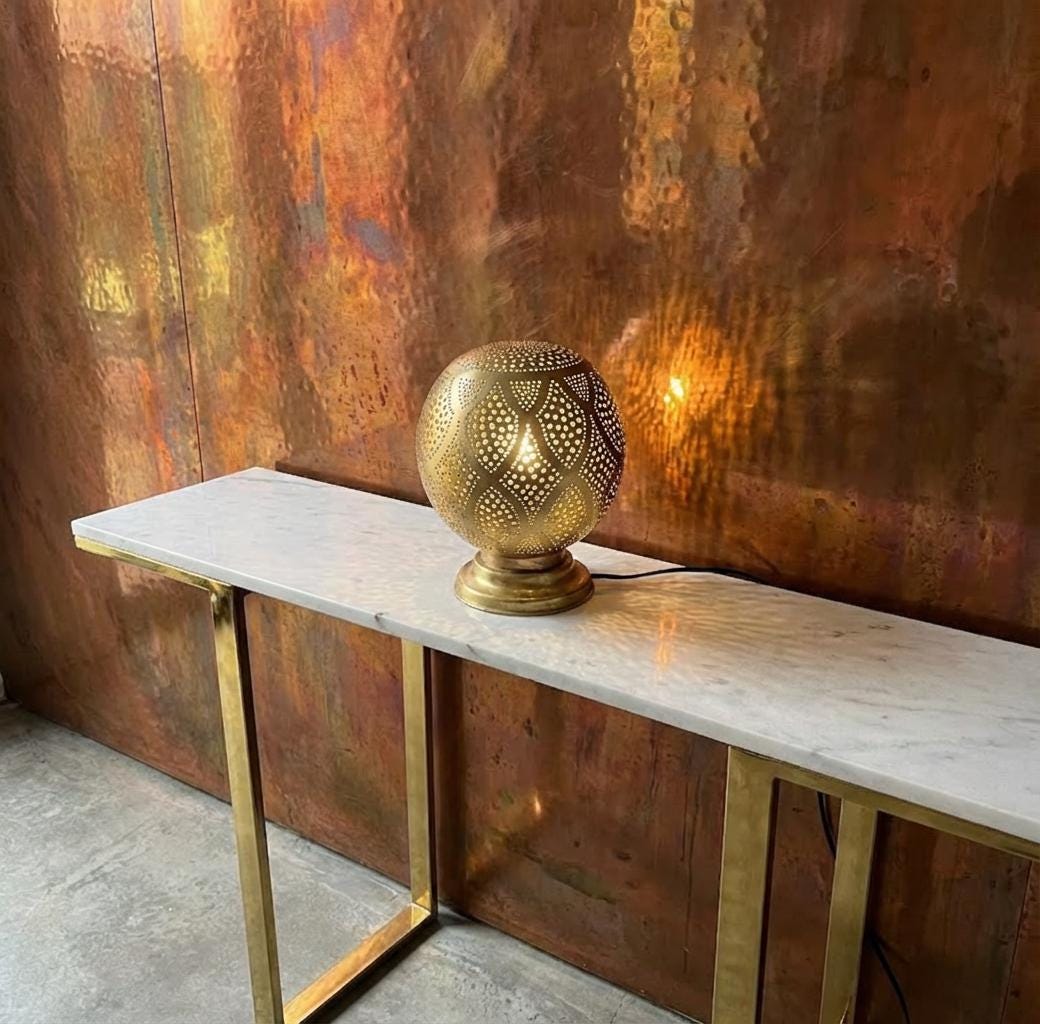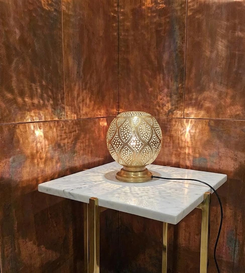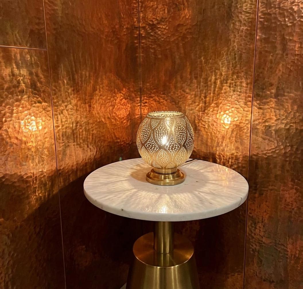 Handcrafted from solid brass with a pearlescent white enamel overlay, this egg-shaped Moroccan table lamp features intricate filigree perforations that project mesmerizing dotted patterns and shadows onto marble tables or terracotta walls. The stable base and inline switch make it plug-in ready for E14 LED bulbs (max 40W), creating soft, warm glow perfect for nightstands, consoles, or living rooms in boho, riad, or art deco styles