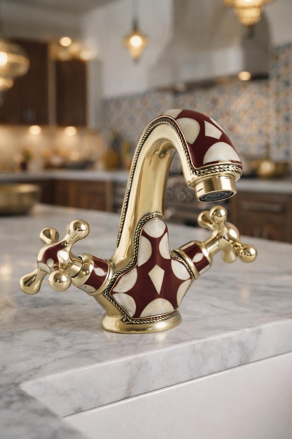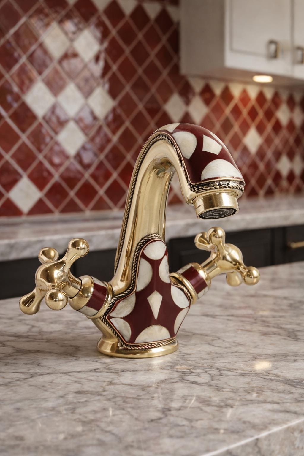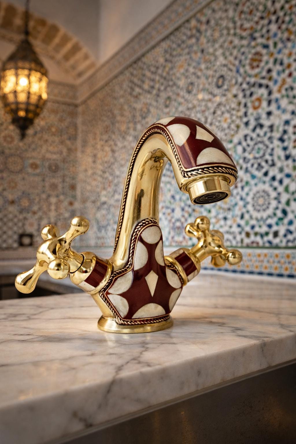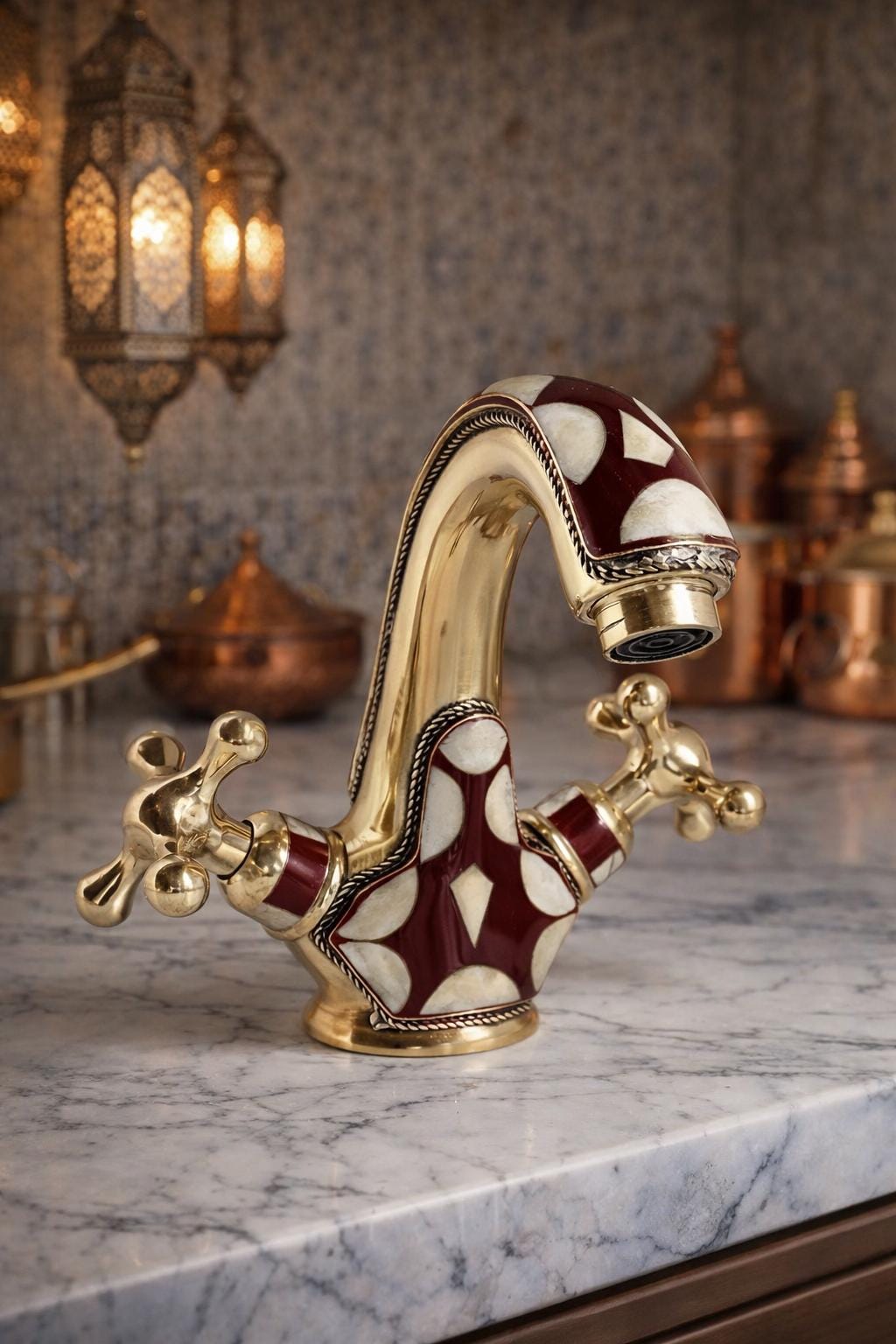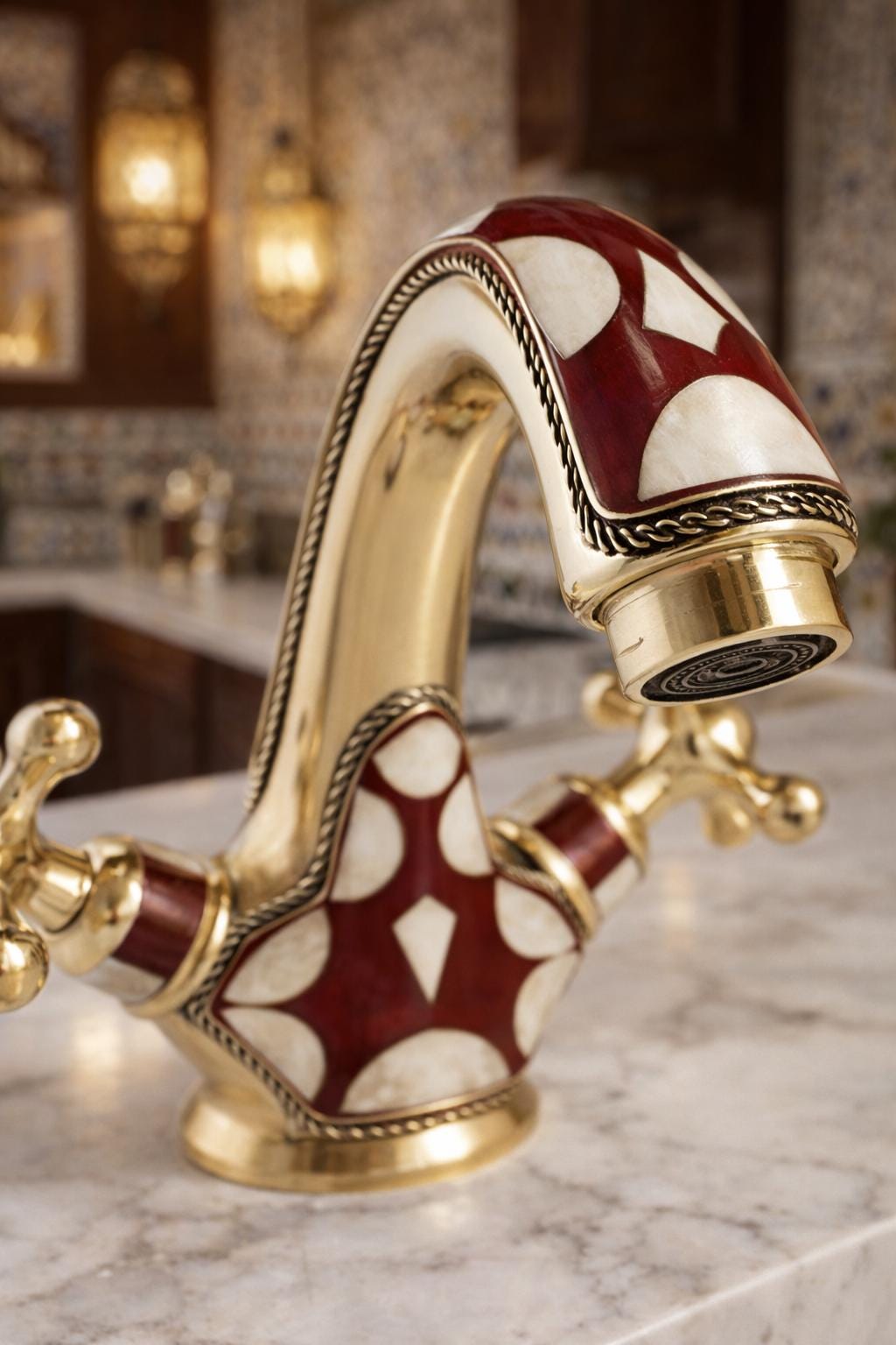 Inspired by the opulent palaces and rich artistic heritage of Morocco, this faucet is a testament to the skill of our master artisans. Each piece is meticulously handcrafted from solid brass and adorned with a striking geometric pattern. The deep burgundy and soft cream inlays are framed by delicate, rope-like brass detailing, adding a layer of texture and sophistication. This is not just a faucet—it's the soul of your room.