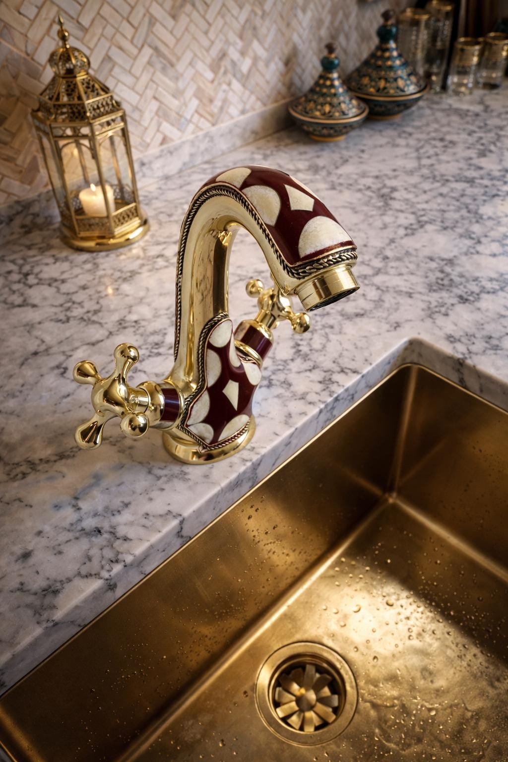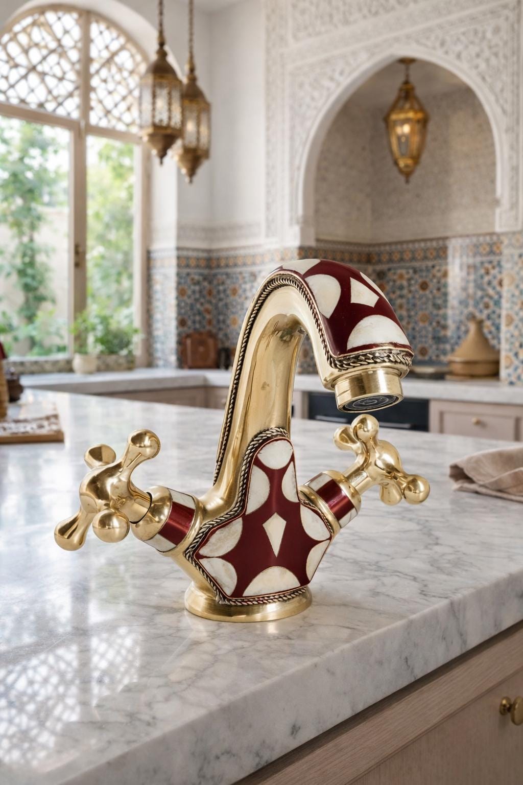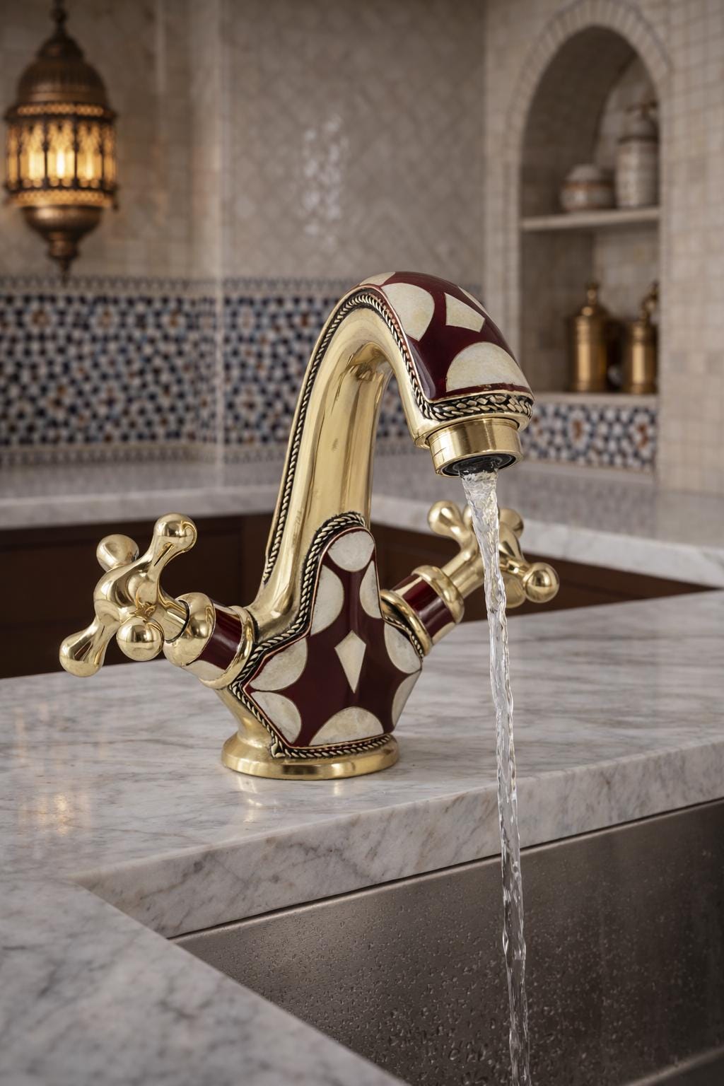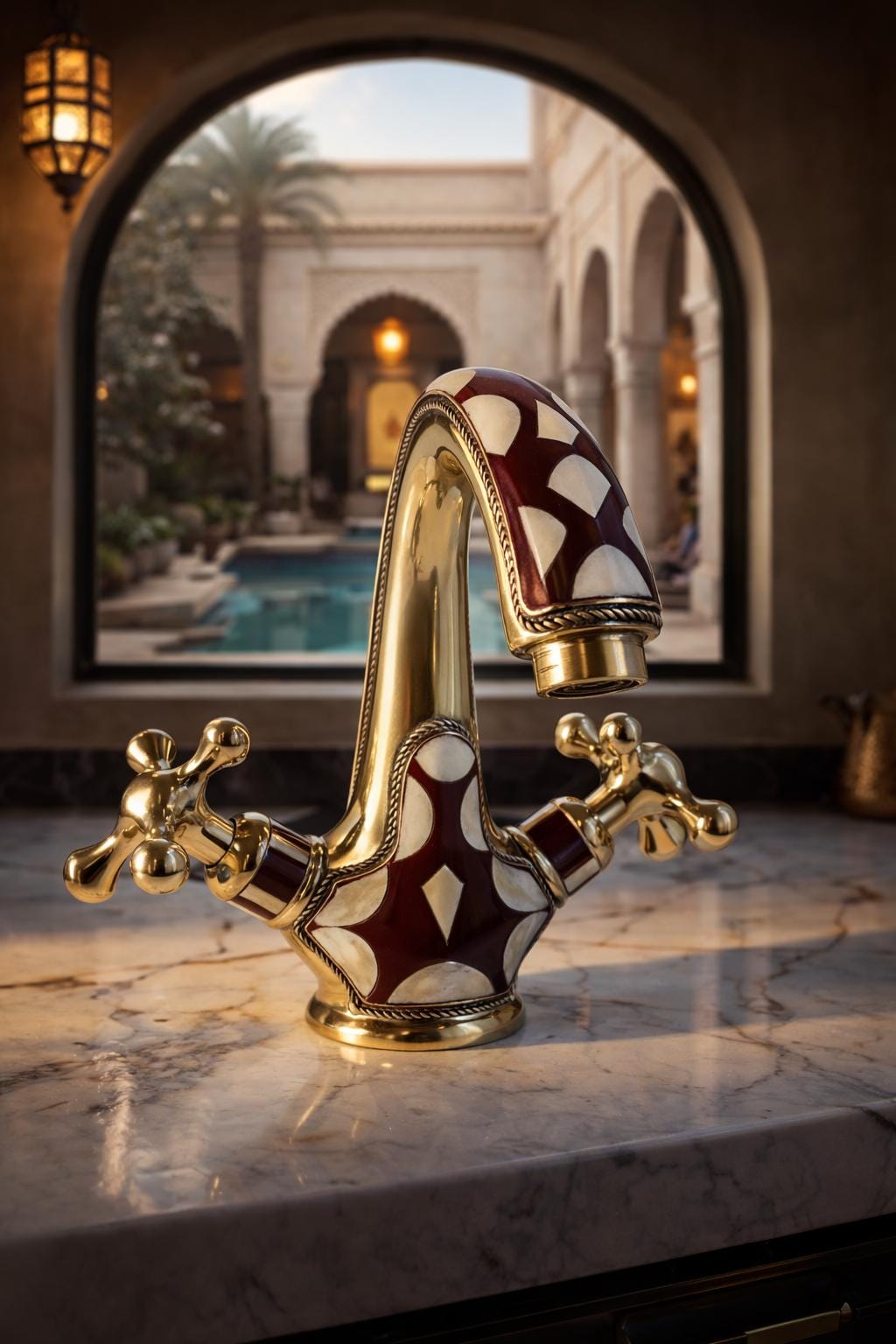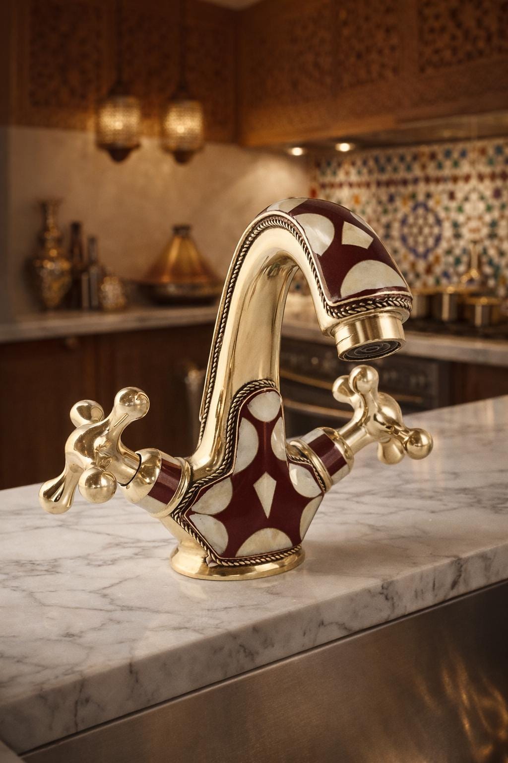 Inspired by the opulent palaces and rich artistic heritage of Morocco, this faucet is a testament to the skill of our master artisans. Each piece is meticulously handcrafted from solid brass and adorned with a striking geometric pattern. The deep burgundy and soft cream inlays are framed by delicate, rope-like brass detailing, adding a layer of texture and sophistication. This is not just a faucet—it's the soul of your room.