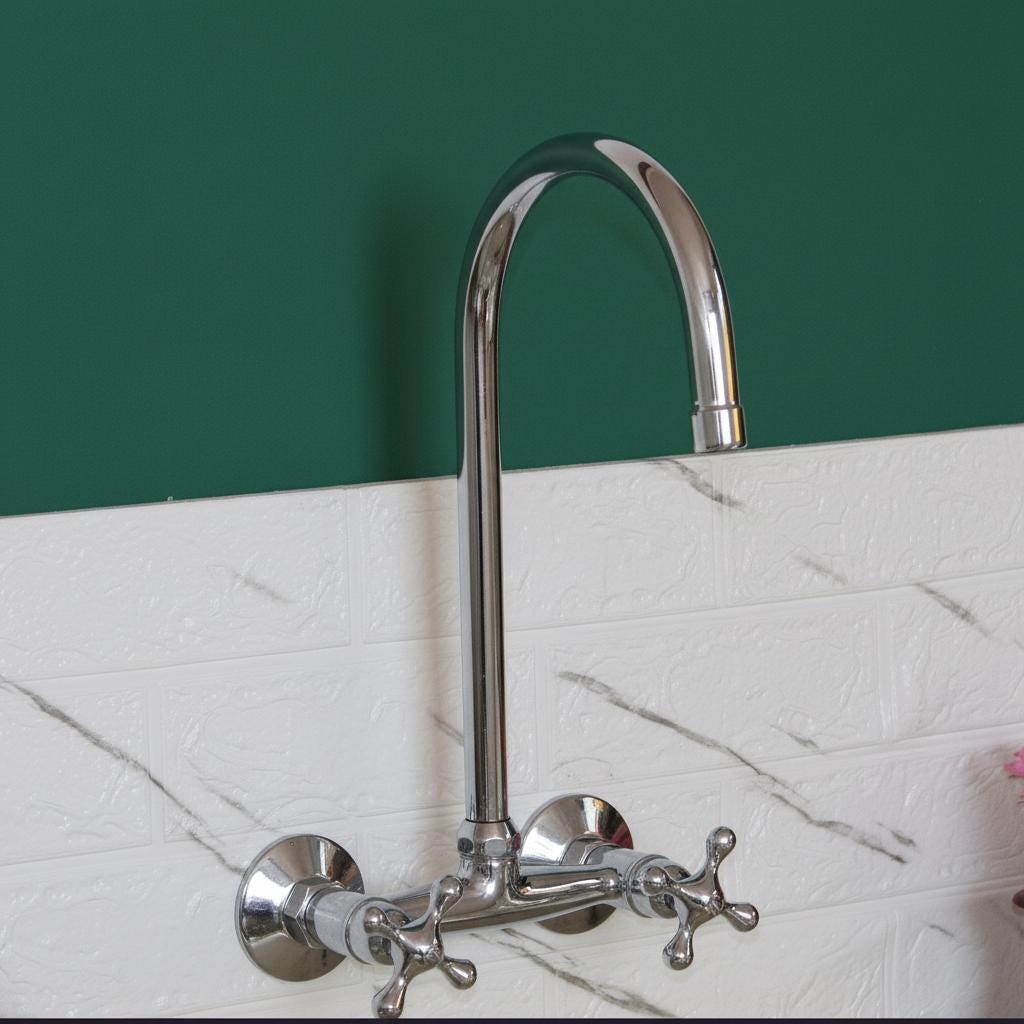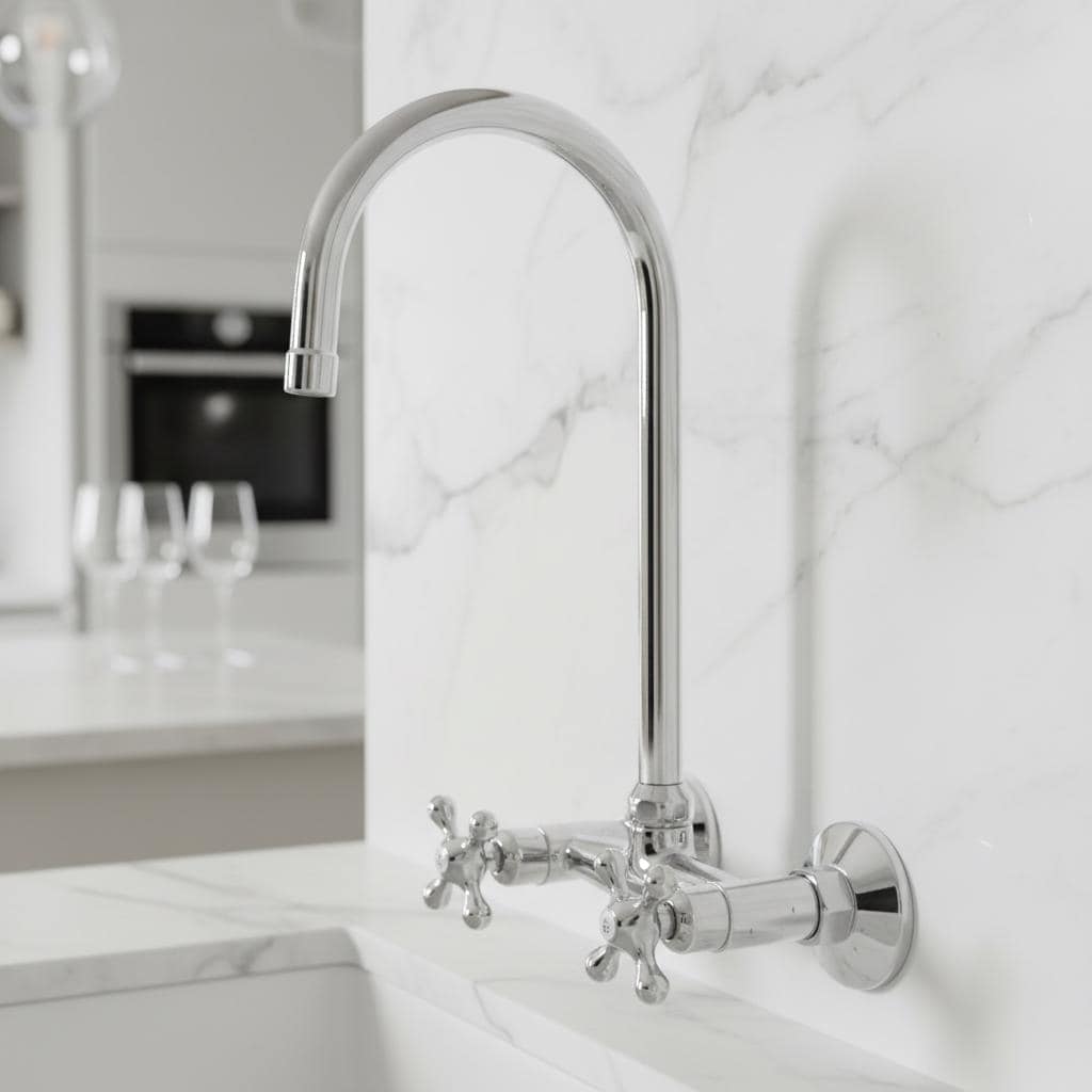 Upgrade your kitchen or bathroom with a piece that blends Victorian charm with modern functionality. This stunning wall-mounted faucet, featuring a graceful gooseneck spout and classic cross-head handles, is more than just a fixture—it’s a statement piece designed to be the heart of your room.
