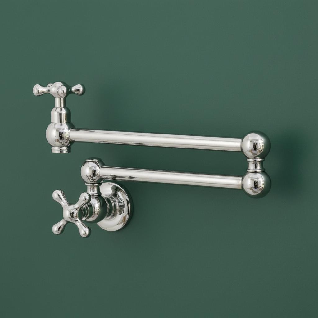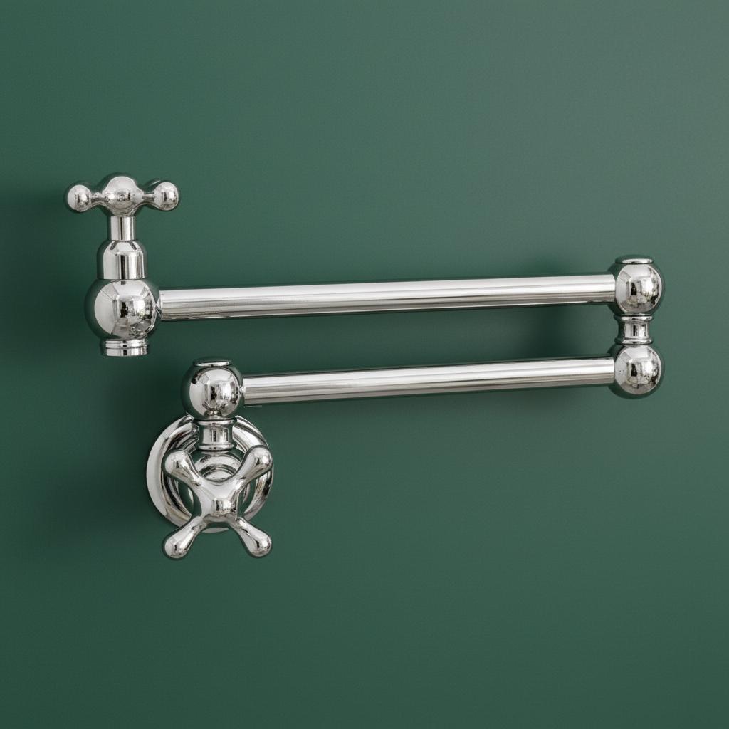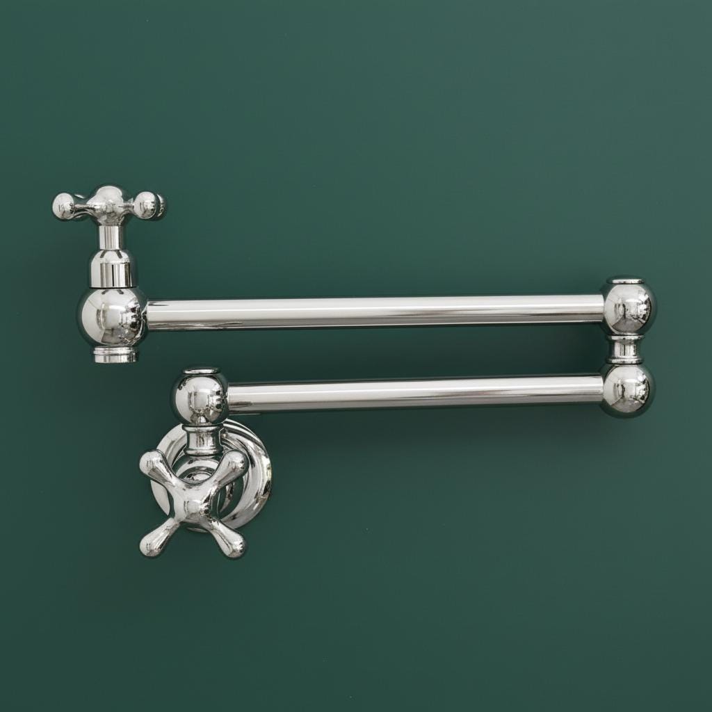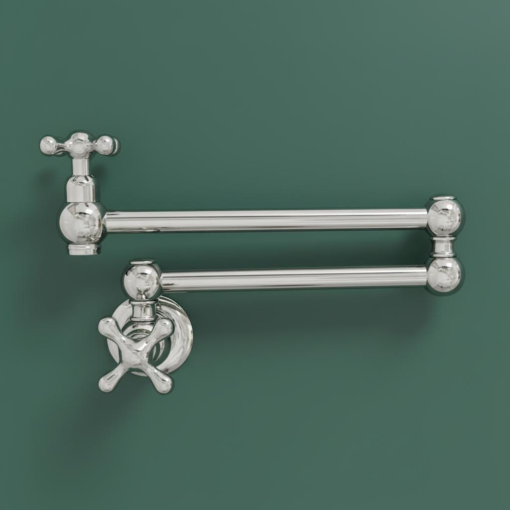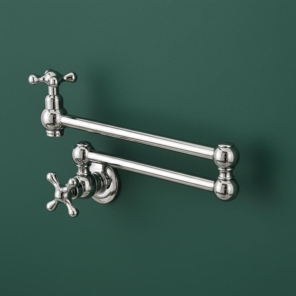 This Unlacquered Brass Pot Filler is not just a faucet; it’s a statement of elegance and utility. Hand-forged from solid brass, this wall-mounted fixture is designed to reach over your stove or sink with ease, then fold neatly against the wall when not in use.