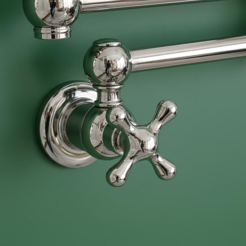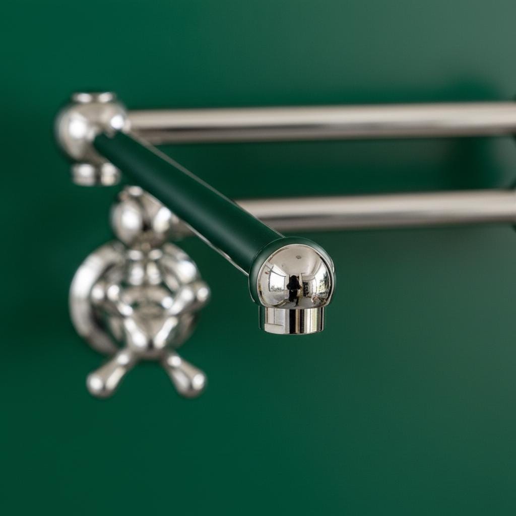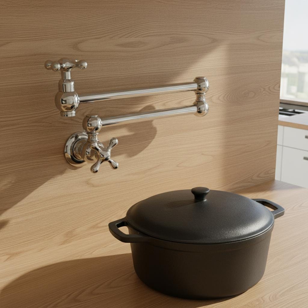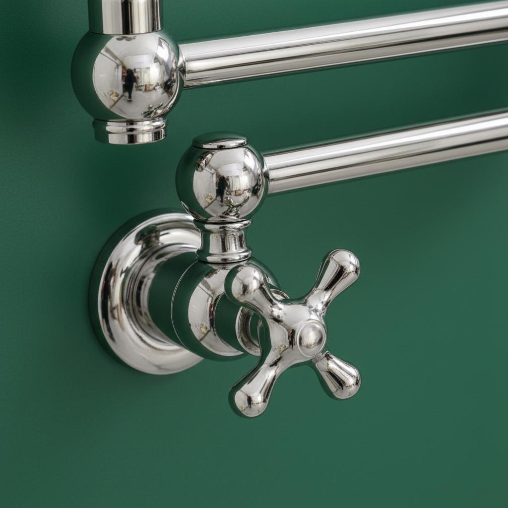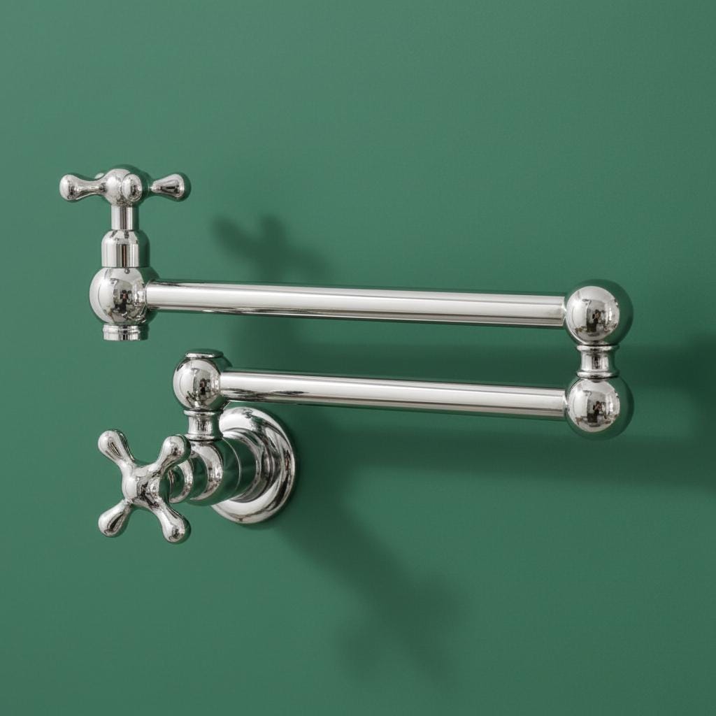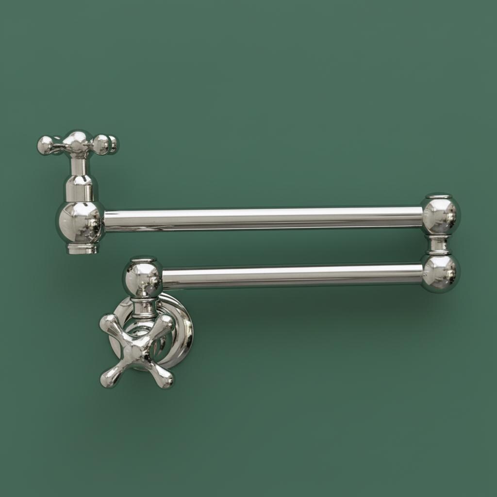 This Unlacquered Brass Pot Filler is not just a faucet; it’s a statement of elegance and utility. Hand-forged from solid brass, this wall-mounted fixture is designed to reach over your stove or sink with ease, then fold neatly against the wall when not in use.