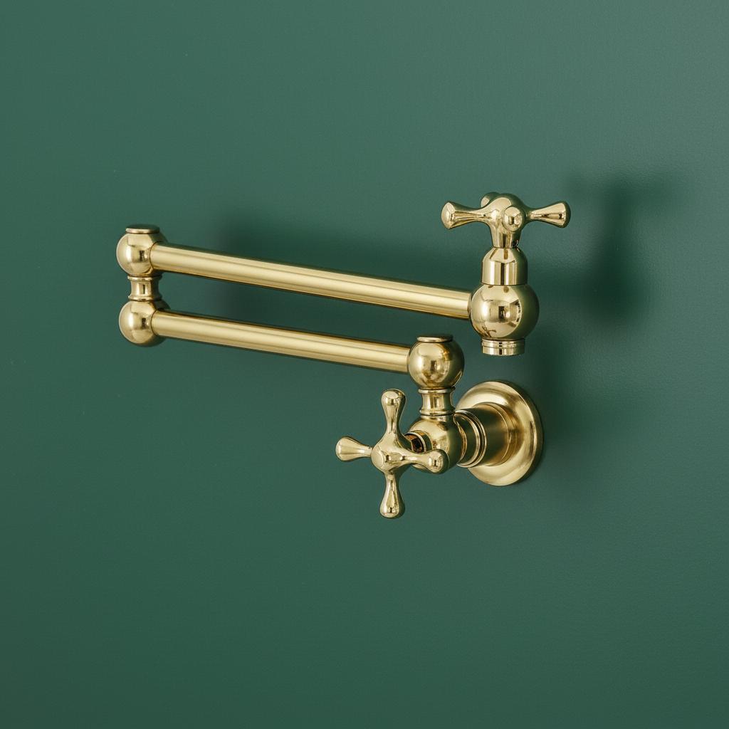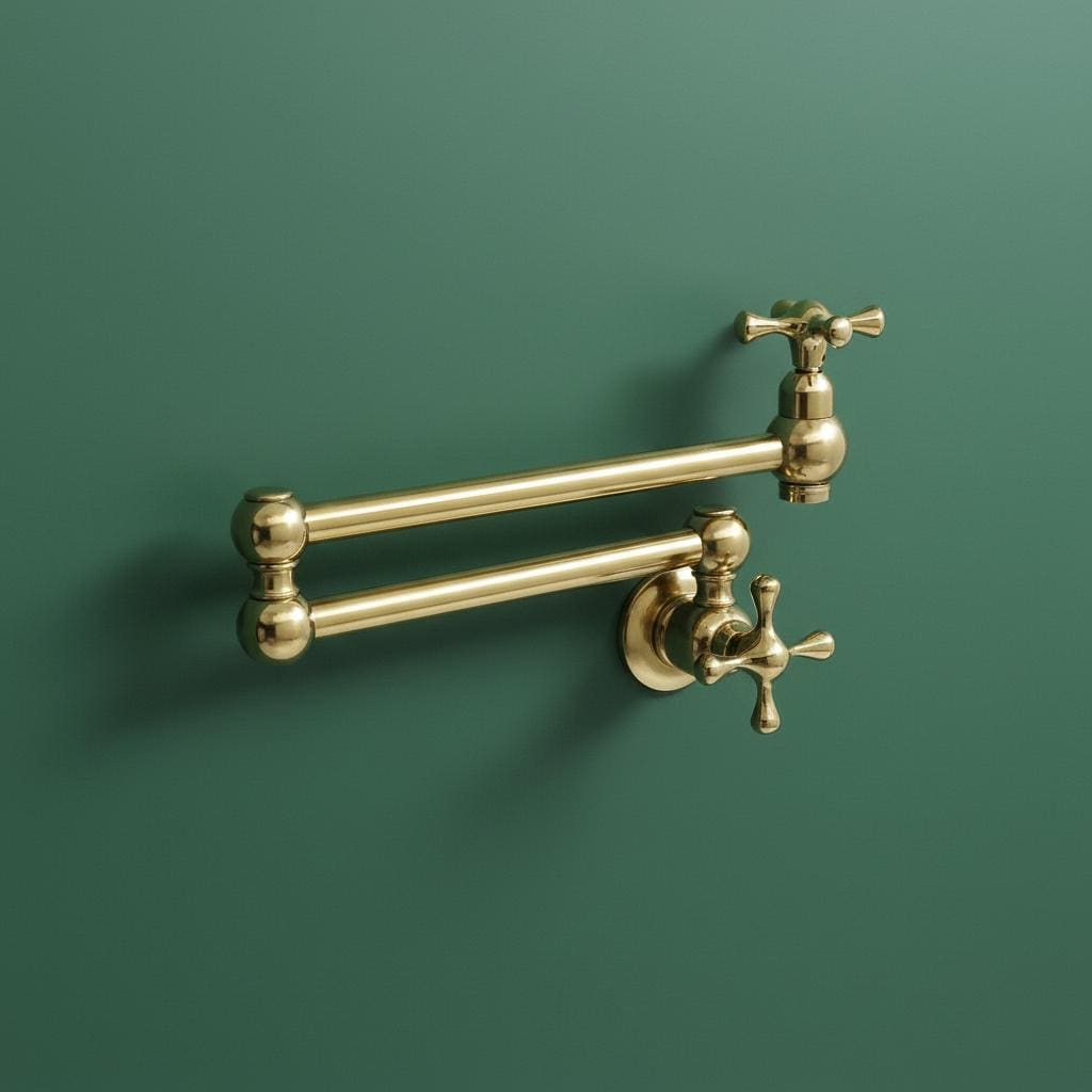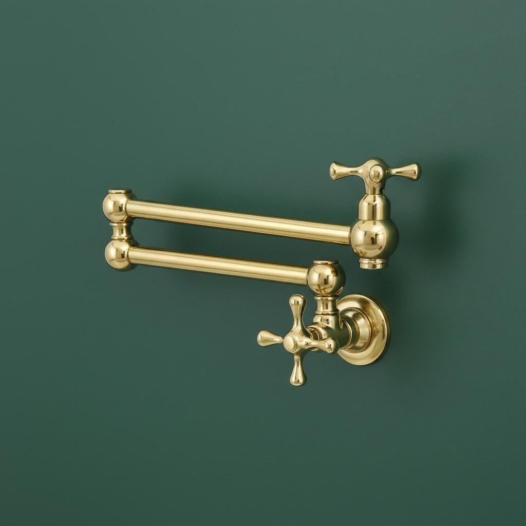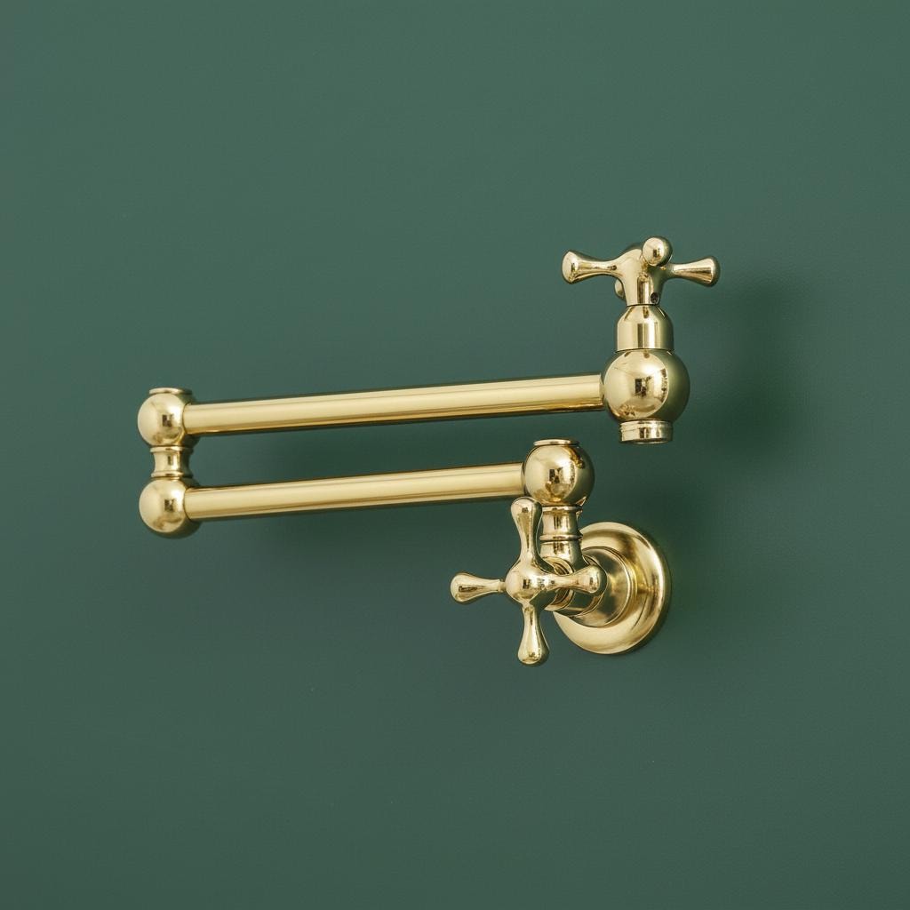 This Unlacquered Brass Pot Filler is not just a faucet; it’s a statement of elegance and utility. Hand-forged from solid brass, this wall-mounted fixture is designed to reach over your stove or sink with ease, then fold neatly against the wall when not in use.
