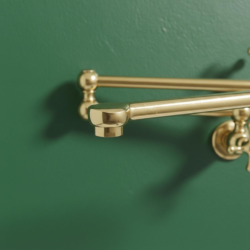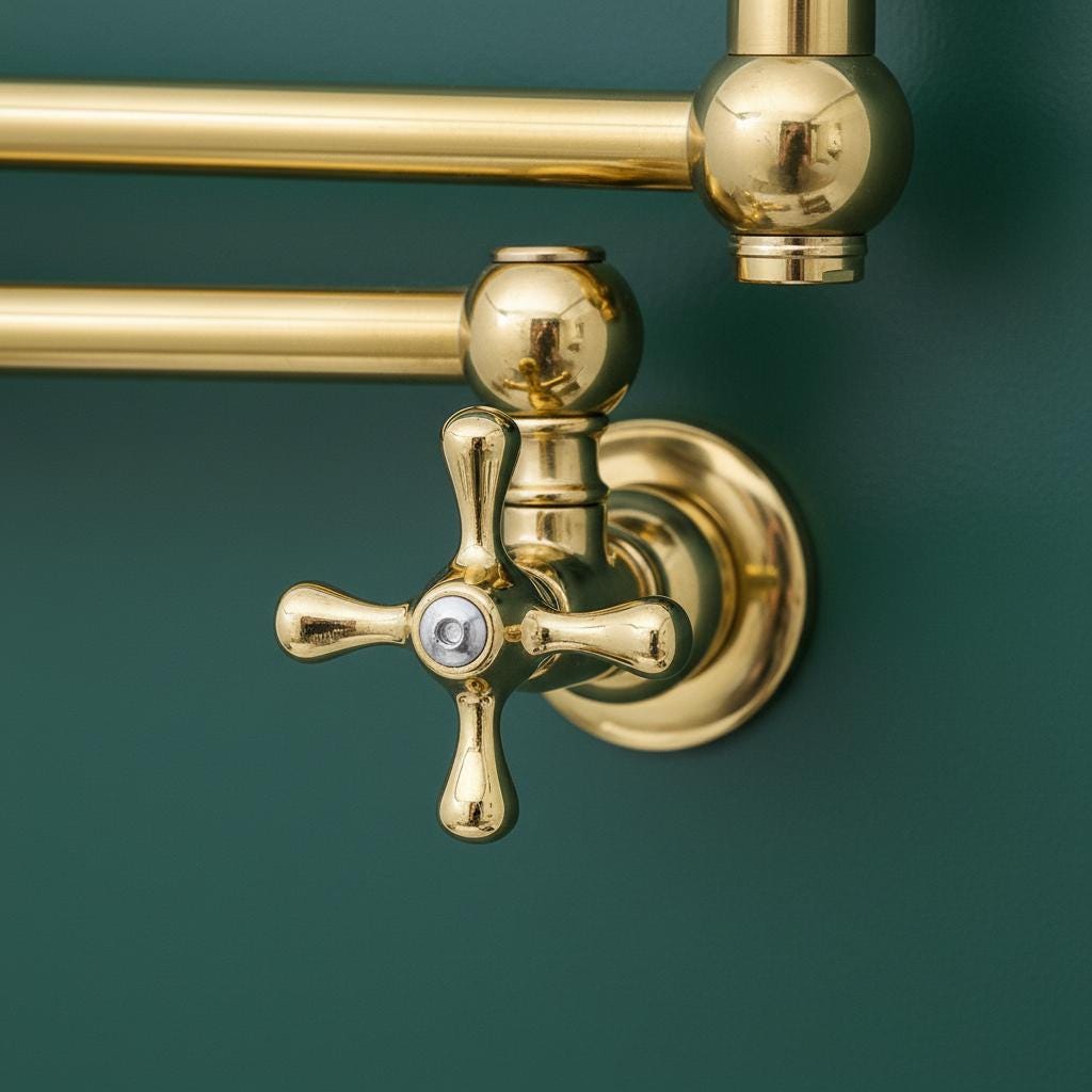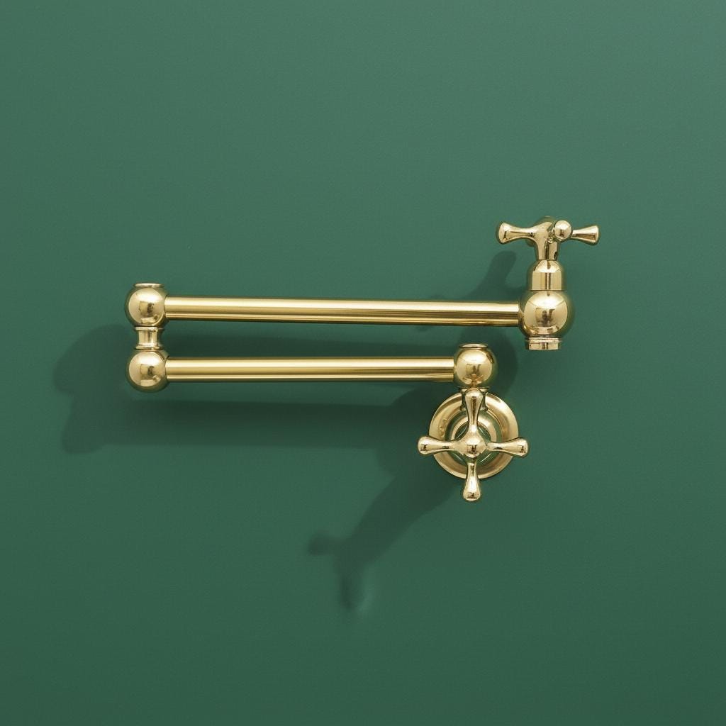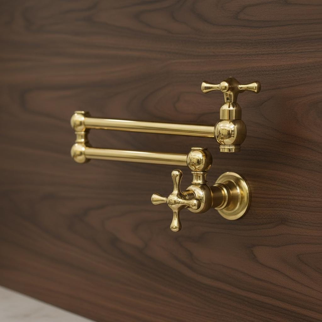 This Unlacquered Brass Pot Filler is not just a faucet; it’s a statement of elegance and utility. Hand-forged from solid brass, this wall-mounted fixture is designed to reach over your stove or sink with ease, then fold neatly against the wall when not in use.
