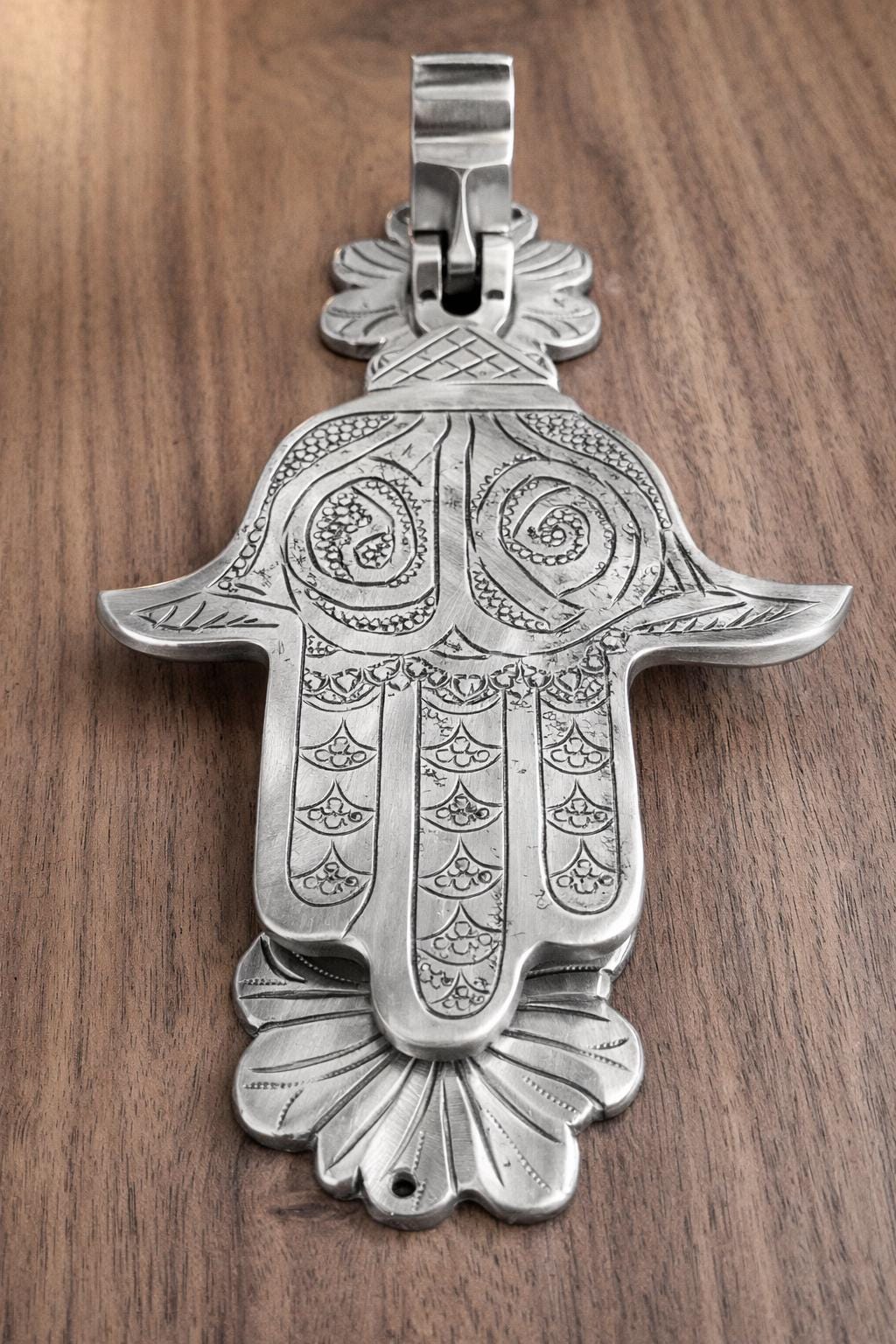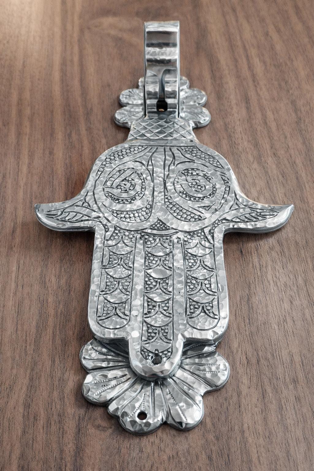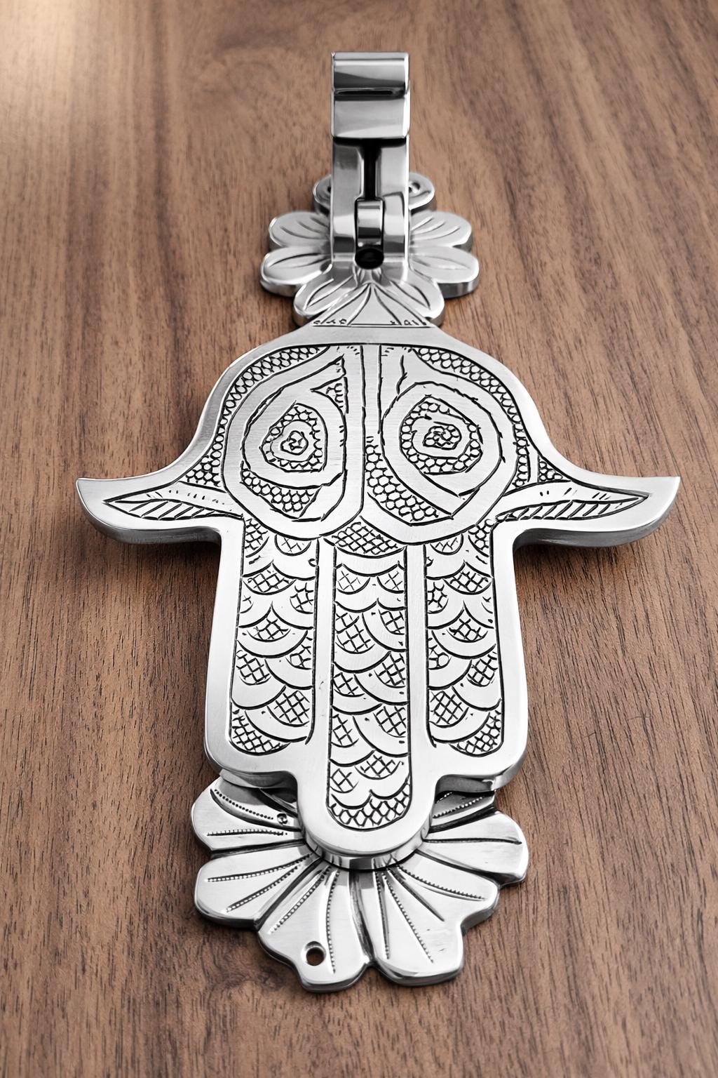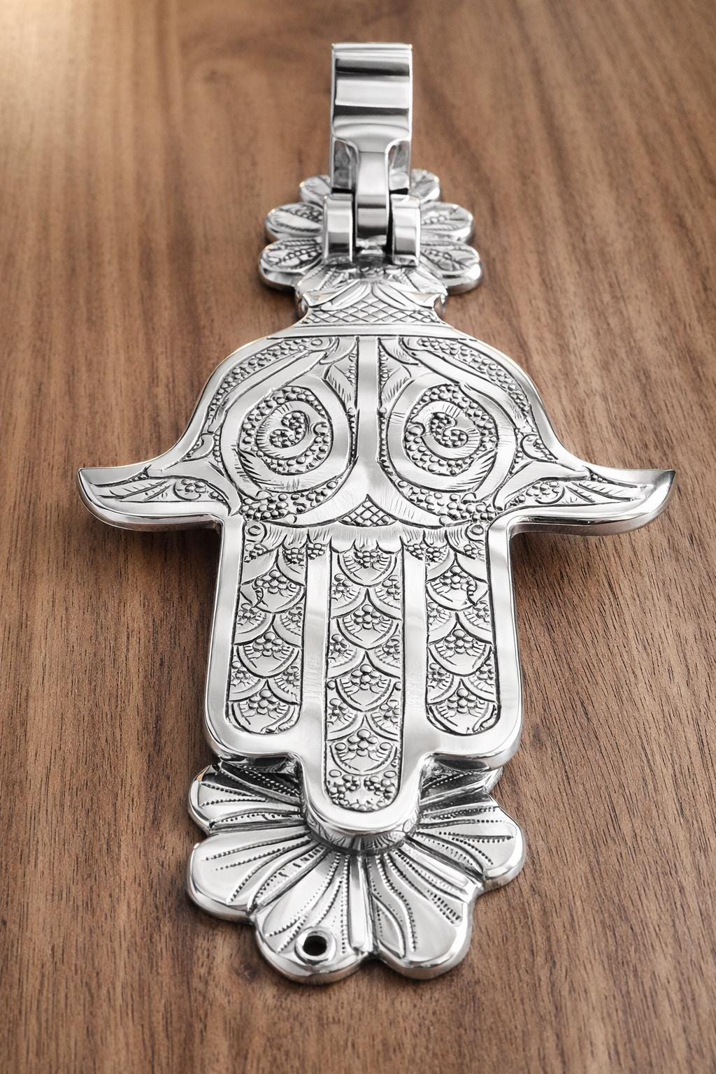 This exquisite piece, also known as the Hand of Fatima or Khamsa, is a centuries-old symbol of protection, believed to ward off the evil eye and bring good fortune to the household. Hand-engraved by skilled artisans, this solid brass knocker features intricate traditional patterns that showcase the rich heritage of Moroccan and Middle Eastern craftsmanship.