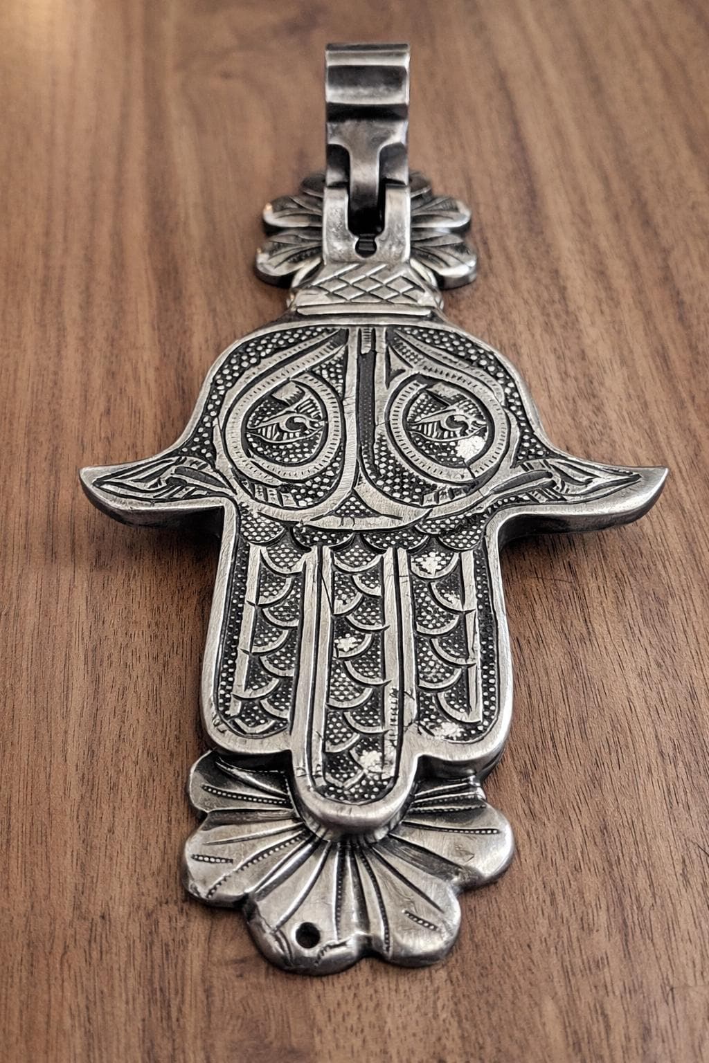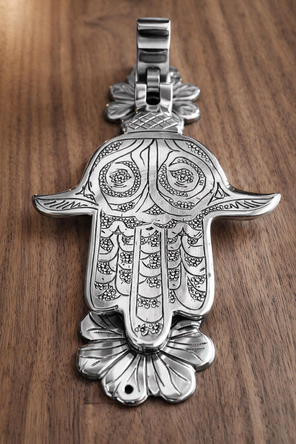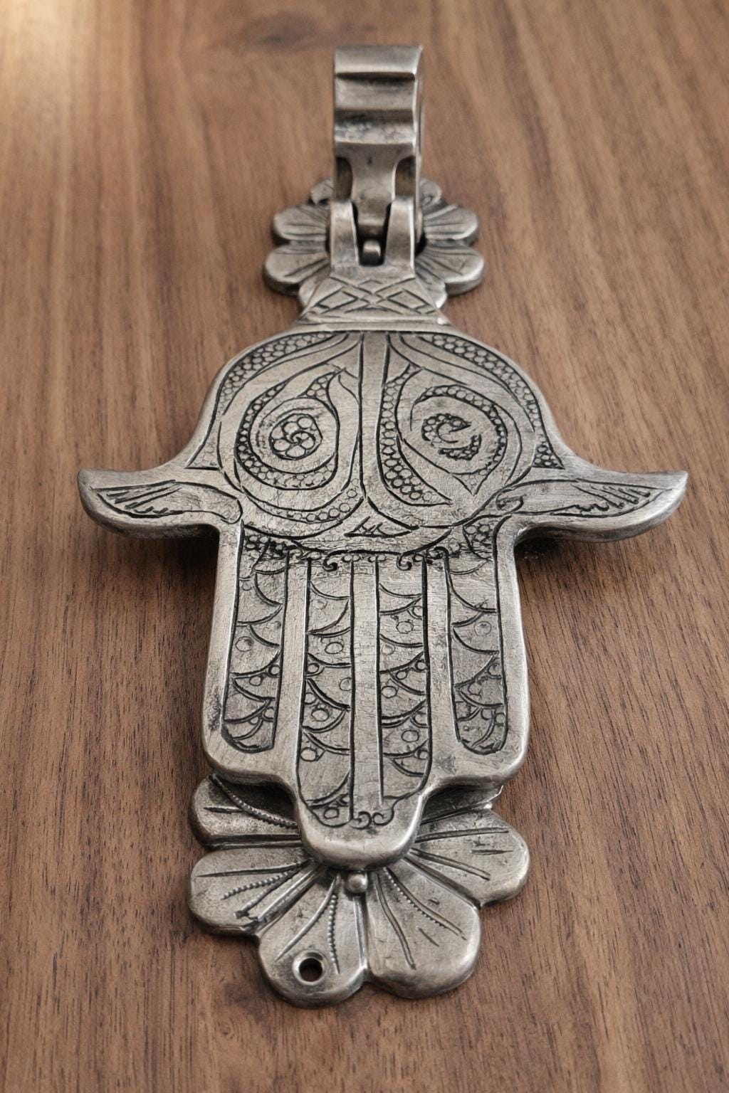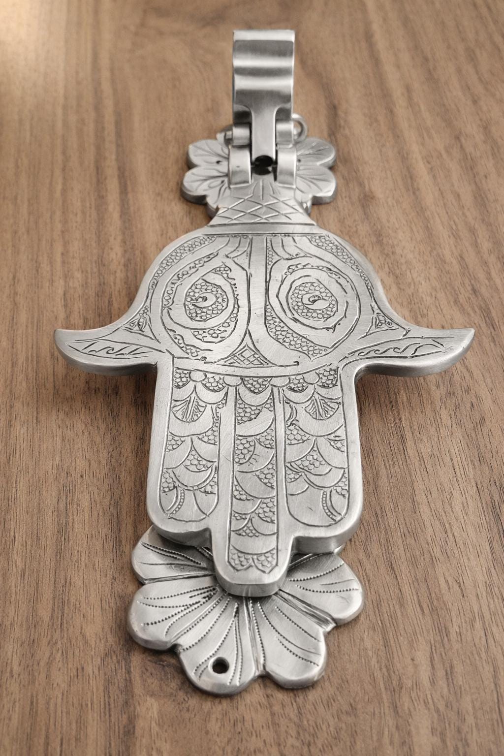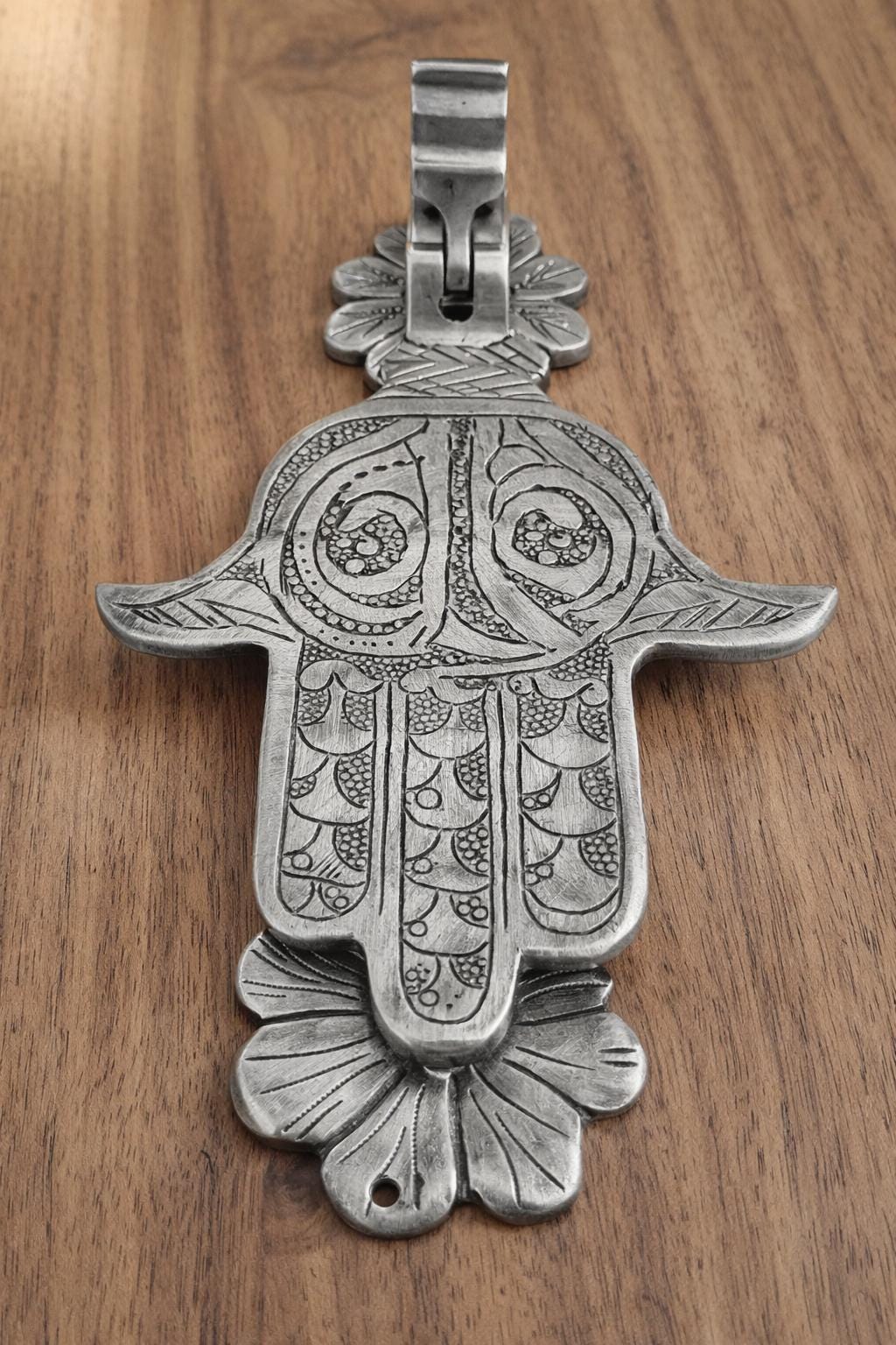 This exquisite piece, also known as the Hand of Fatima or Khamsa, is a centuries-old symbol of protection, believed to ward off the evil eye and bring good fortune to the household. Hand-engraved by skilled artisans, this solid brass knocker features intricate traditional patterns that showcase the rich heritage of Moroccan and Middle Eastern craftsmanship.