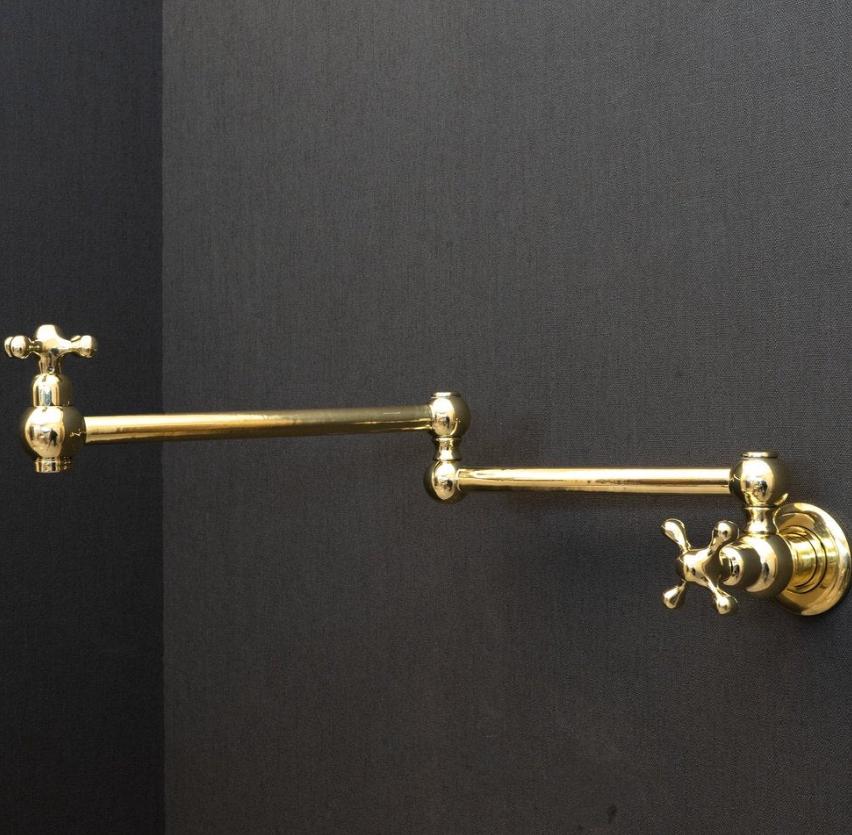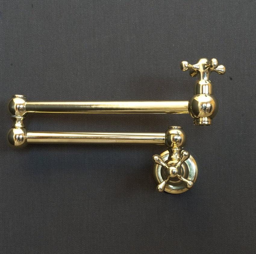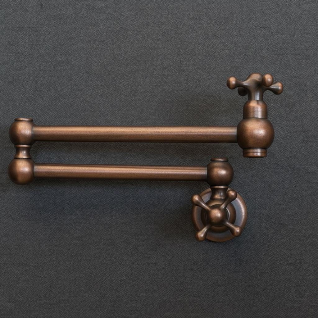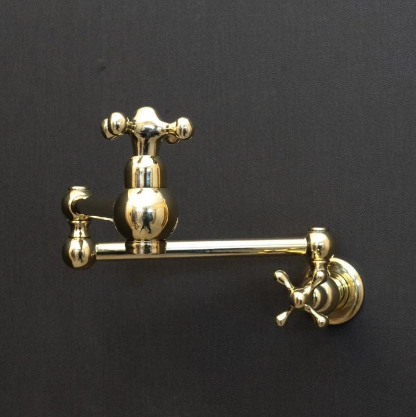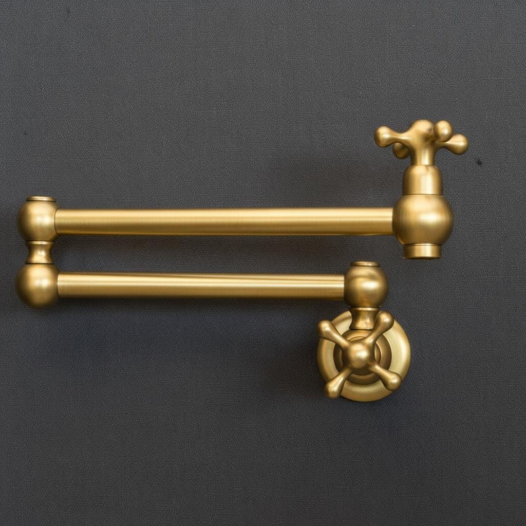 Product OverviewBring timeless elegance to your culinary space with our Handcrafted Unlacquered Brass Pot Filler. Designed for the passionate home chef, this vintage-style faucet combines old-world craftsmanship with modern functionality. Made from high-quality solid brass, it features a "living finish" that develops a unique, rich patina over time, making every piece a one-of-a-kind masterpiece in your kitchen.Key Features & BenefitsAuthentic Unlacquered Brass: Unlike mass-produced fixtures, our brass is left raw to age naturally, offering that coveted antique look that only gets better with time.Double-Jointed Reach: The flexible, swing-out arm extends up to 24 inches, allowing you to fill large stockpots directly on the stove, then tucks away flush against the wall to save space.Artisanal Craftsmanship: Each pot filler is individually handcrafted by skilled artisans, ensuring superior build quality and attention to detail.High-Flow Performance: Engineered for efficiency, providing a steady, high-volume water flow to fill even the largest pots in seconds.Leak-Free Technology: Equipped with premium ceramic disc cartridges for smooth operation and a drip-free experience.Technical SpecificationsFeatureDetailsMaterial100% Solid Lead-Free BrassFinishUnlacquered Raw Brass (Will Patina Naturally)InstallationWall-Mounted / Single HoleHandle TypeDual Cross or Lever Handles (Vintage Style)ReachFull extension of 22-24"ValvesCeramic Disc CartridgesCare & MaintenanceBecause this is unlacquered brass, it will darken and spot naturally.For the Vintage Look: Simply wipe with a soft cloth after use.For the Polished Look: If you prefer the bright gold shine, a quick polish with a brass cleaner (like Brasso) will restore its original luster.