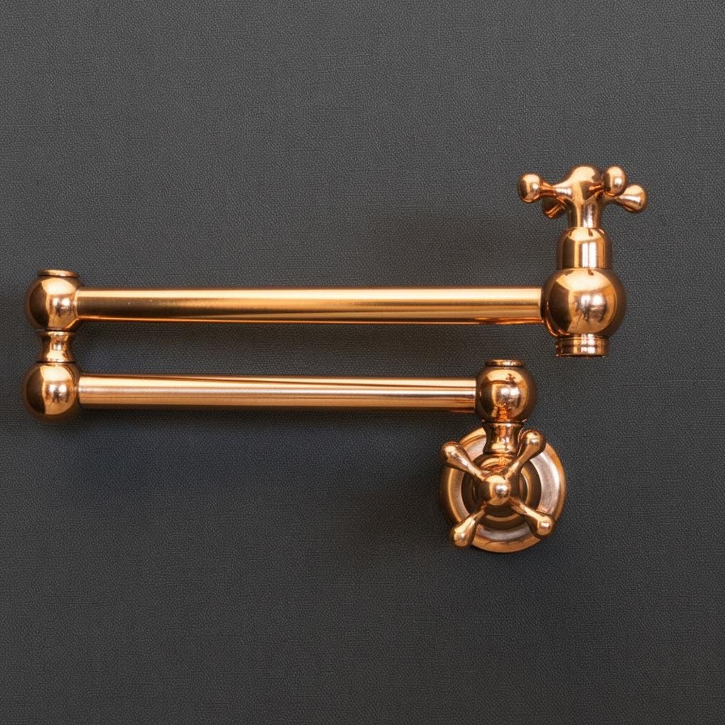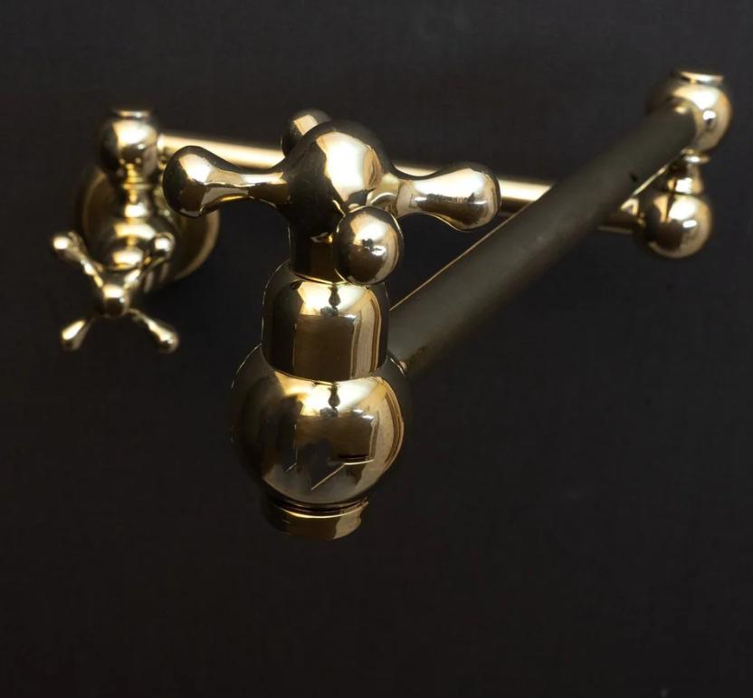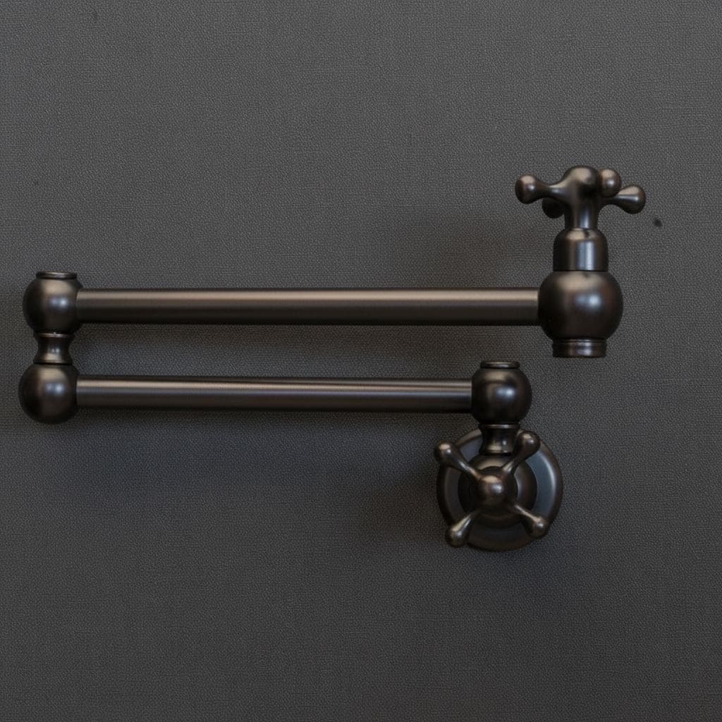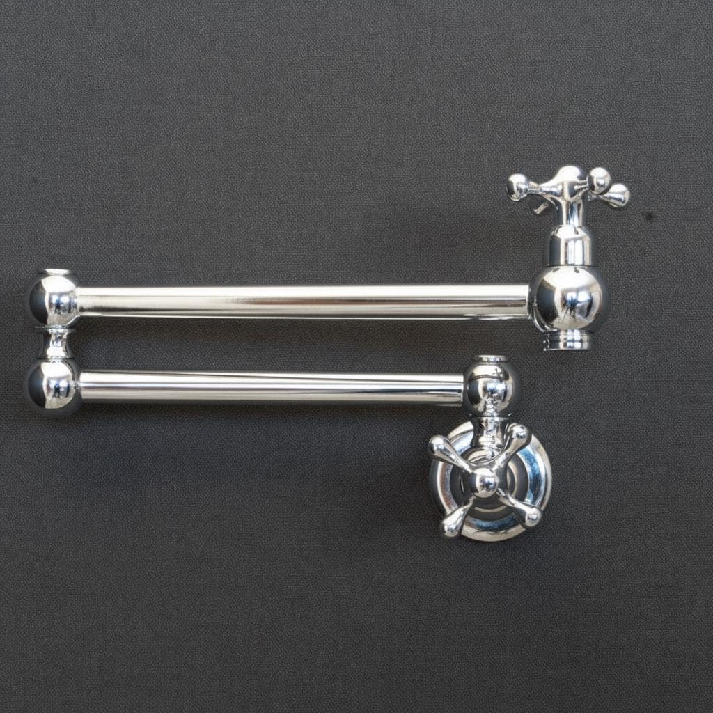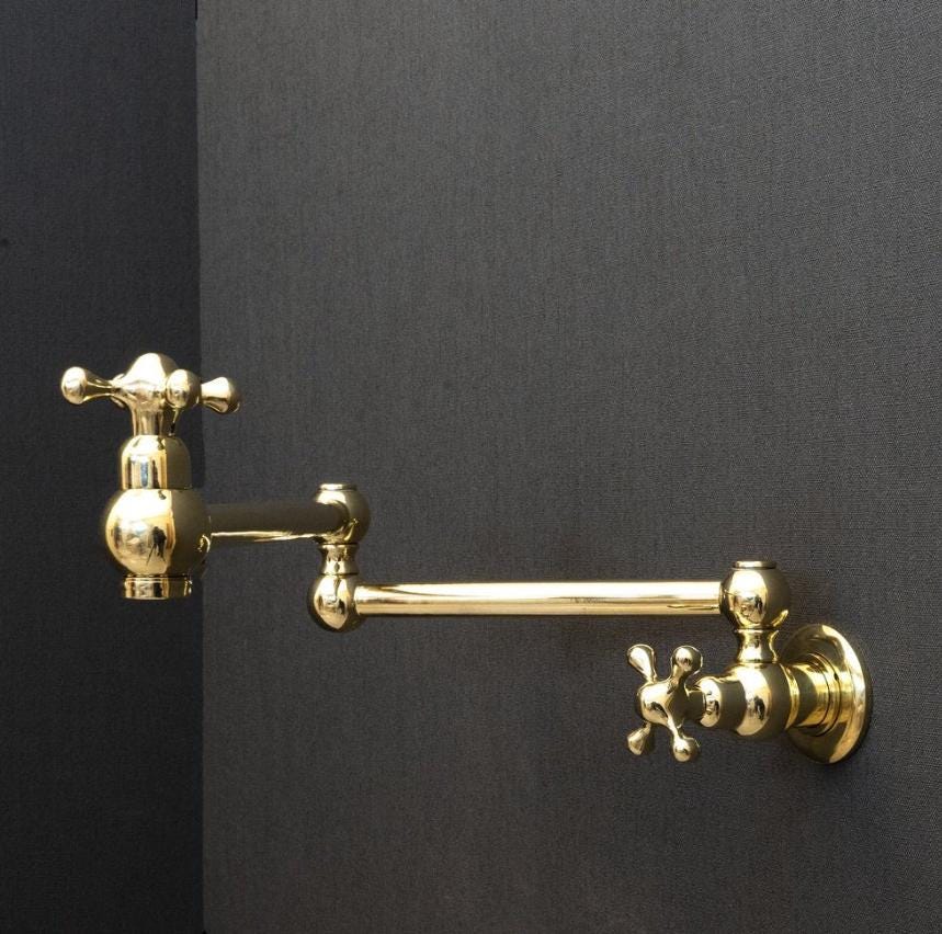 Product OverviewBring timeless elegance to your culinary space with our Handcrafted Unlacquered Brass Pot Filler. Designed for the passionate home chef, this vintage-style faucet combines old-world craftsmanship with modern functionality. Made from high-quality solid brass, it features a "living finish" that develops a unique, rich patina over time, making every piece a one-of-a-kind masterpiece in your kitchen.Key Features & BenefitsAuthentic Unlacquered Brass: Unlike mass-produced fixtures, our brass is left raw to age naturally, offering that coveted antique look that only gets better with time.Double-Jointed Reach: The flexible, swing-out arm extends up to 24 inches, allowing you to fill large stockpots directly on the stove, then tucks away flush against the wall to save space.Artisanal Craftsmanship: Each pot filler is individually handcrafted by skilled artisans, ensuring superior build quality and attention to detail.High-Flow Performance: Engineered for efficiency, providing a steady, high-volume water flow to fill even the largest pots in seconds.Leak-Free Technology: Equipped with premium ceramic disc cartridges for smooth operation and a drip-free experience.Technical SpecificationsFeatureDetailsMaterial100% Solid Lead-Free BrassFinishUnlacquered Raw Brass (Will Patina Naturally)InstallationWall-Mounted / Single HoleHandle TypeDual Cross or Lever Handles (Vintage Style)ReachFull extension of 22-24"ValvesCeramic Disc CartridgesCare & MaintenanceBecause this is unlacquered brass, it will darken and spot naturally.For the Vintage Look: Simply wipe with a soft cloth after use.For the Polished Look: If you prefer the bright gold shine, a quick polish with a brass cleaner (like Brasso) will restore its original luster.