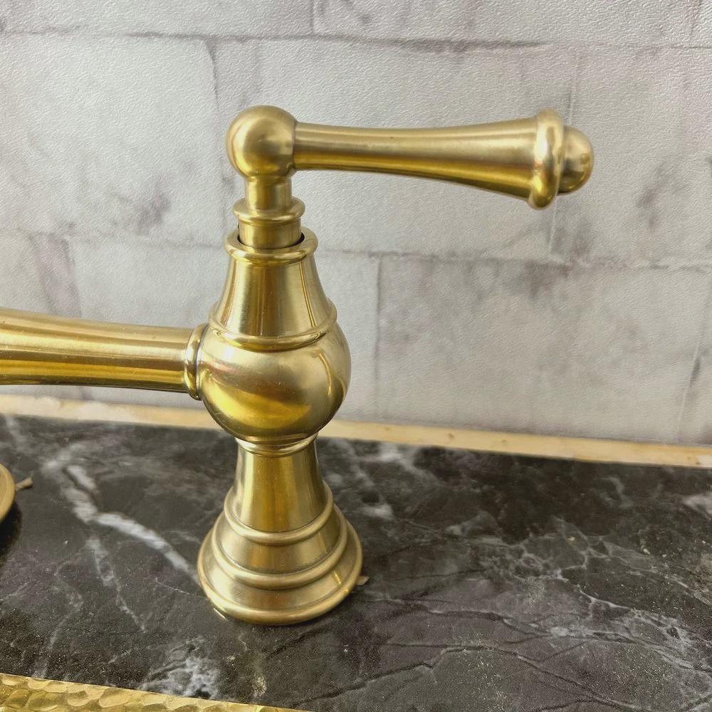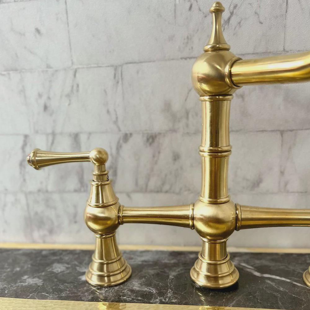 Elevate your kitchen with this stunning Handcrafted Unlacquered Brass Bridge Faucet.